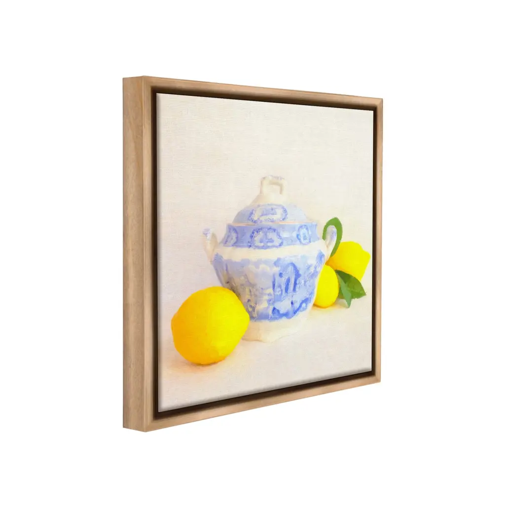 Elevate your home or office to the next level with Stupell Framed Floating Canvas Wall Art. Our premium hand-stretched canvas is mounted securely into a sturdy lightweight frame. The museum-style gap between the wrapped canvas and the box frame gives the illusion of floating artwork. Stupell Wall Art is made in the USA.Features: Dimensions: 18 x 1.7 x 18 Frame, 17 x 1.5 x 17 Canvas ArtFloating Frame Canvas Products are available in sizes 18"x18" and 25"x25". All Floating Frame Canvas Products have a 1.7" Depth.Wall Art is Ready to Hang with Hardware Free Hanging. No Installation required. For Easy Set Up Lean or Layer Artwork on Shelf or Against Wall. Artwork is Permently Fixed into the Frame.Our elevated 1.7" Thick Floating Frame is the perfect complement to our canvas style Wall Art. We use only the highest quality inks in house with industry leading printing solutions. Canvas is hand stretched over a durable wood foundation and then mounted securly into a Modern Box Frame. Made in the USA.Artwork Relates To: Pottery, Citrus, Fruit, Lemon, Plant, Produce, Teapot, Porcelain, Vintage, Still LifeDesign by GraffiTee Studios