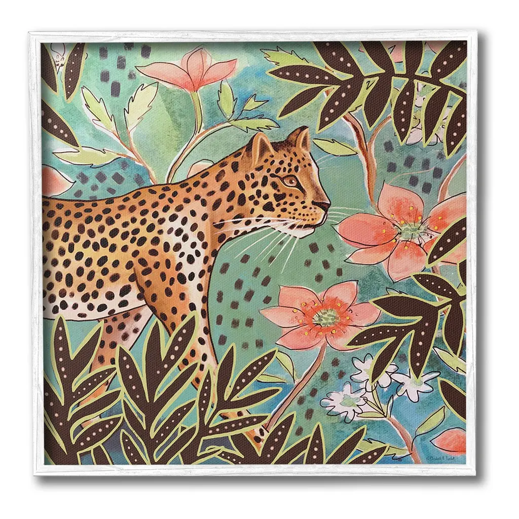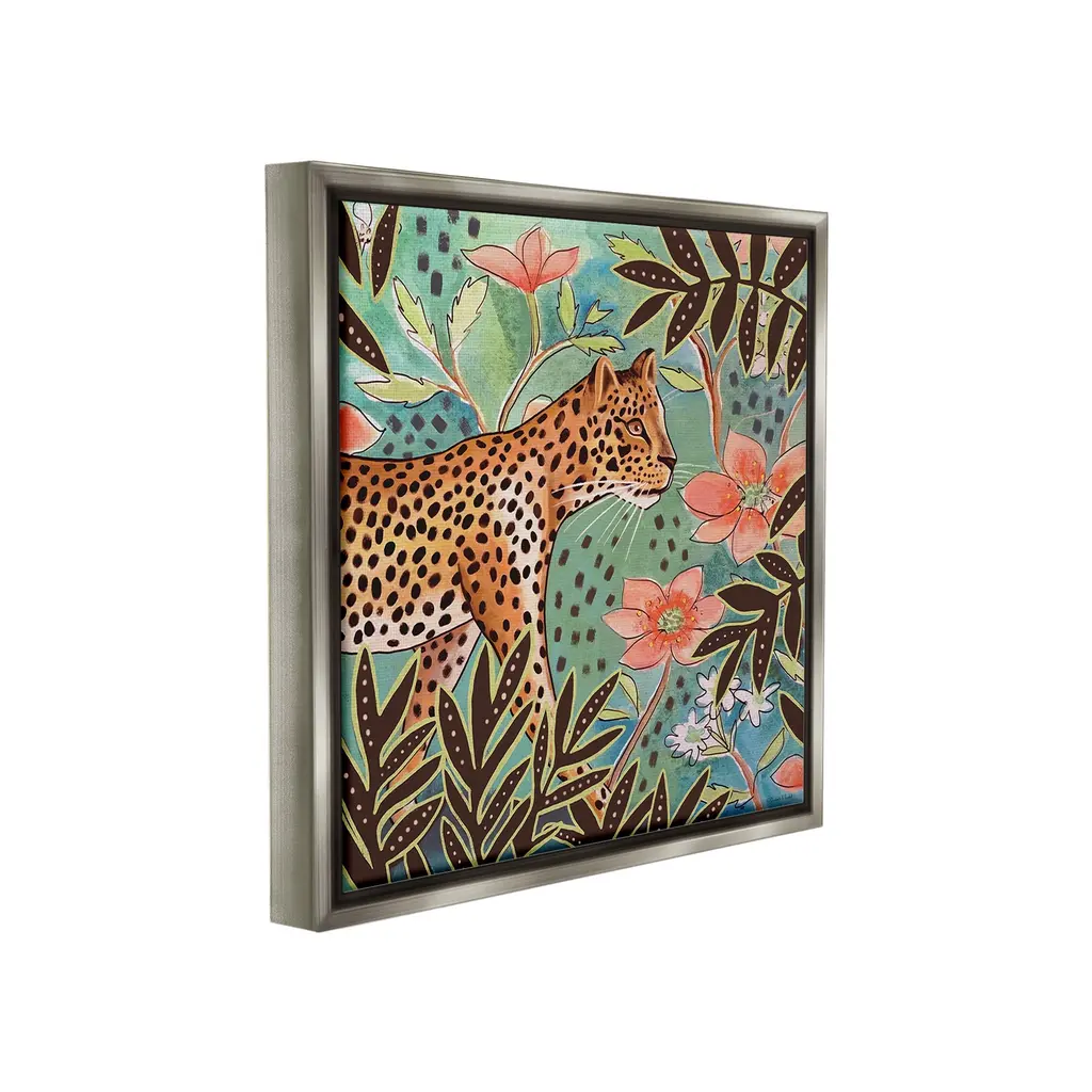 Elevate your home or office to the next level with Stupell Framed Floating Canvas Wall Art. Our premium hand-stretched canvas is mounted securely into a sturdy lightweight frame. The museum-style gap between the wrapped canvas and the box frame gives the illusion of floating artwork. Stupell Wall Art is made in the USA.Features: Dimensions: 18 x 1.7 x 18 Frame, 17 x 1.5 x 17 Canvas ArtFloating Frame Canvas Products are available in sizes 18"x18" and 25"x25". All Floating Frame Canvas Products have a 1.7" Depth.Wall Art is Ready to Hang with Hardware Free Hanging. No Installation required. For Easy Set Up Lean or Layer Artwork on Shelf or Against Wall. Artwork is Permently Fixed into the Frame.Our elevated 1.7" Thick Floating Frame is the perfect complement to our canvas style Wall Art. We use only the highest quality inks in house with industry leading printing solutions. Canvas is hand stretched over a durable wood foundation and then mounted securly into a Modern Box Frame. Made in the USA.Artwork Relates To: Pattern, Animal, Wildlife, Mammal, Floral, Leopard, Cheetah, Plant, Botanical, Leaf, JungleDesign by Elizabeth Tyndall