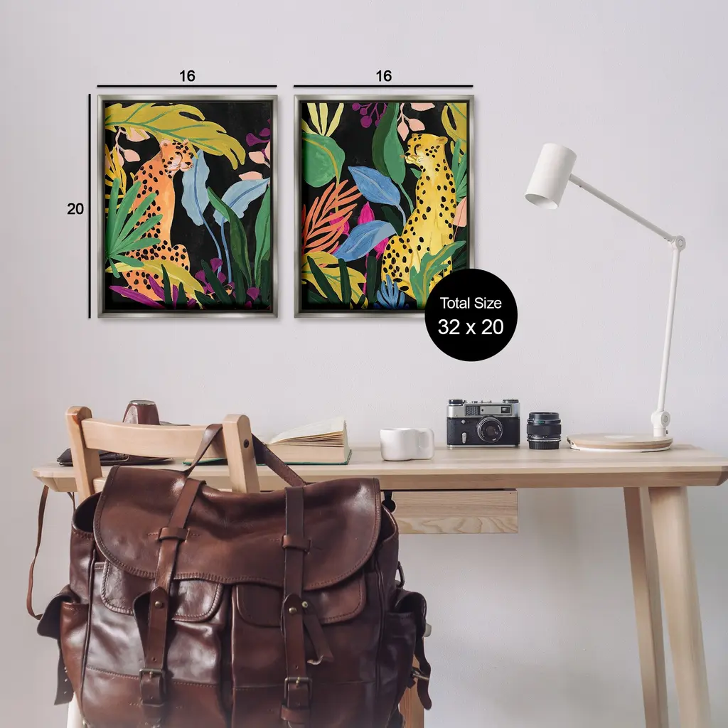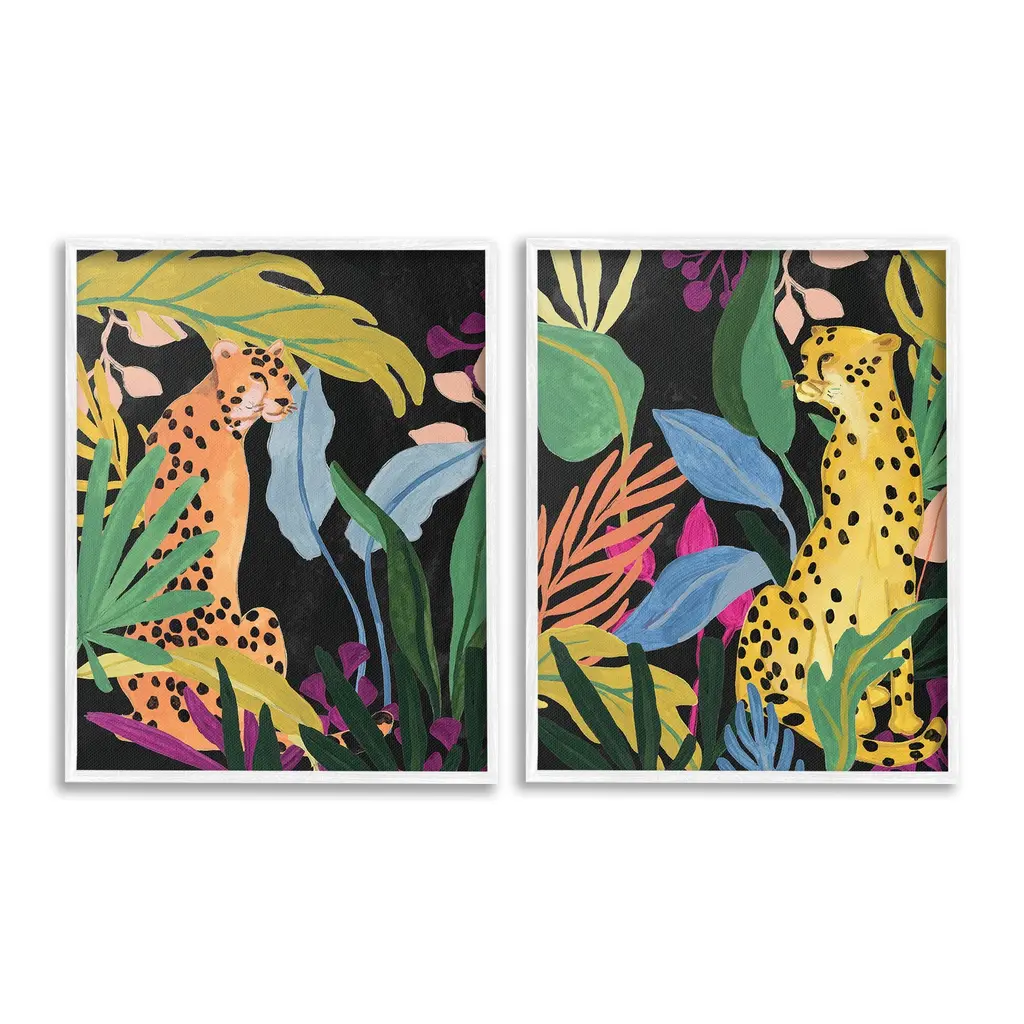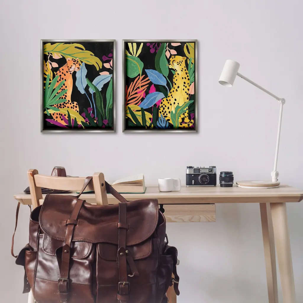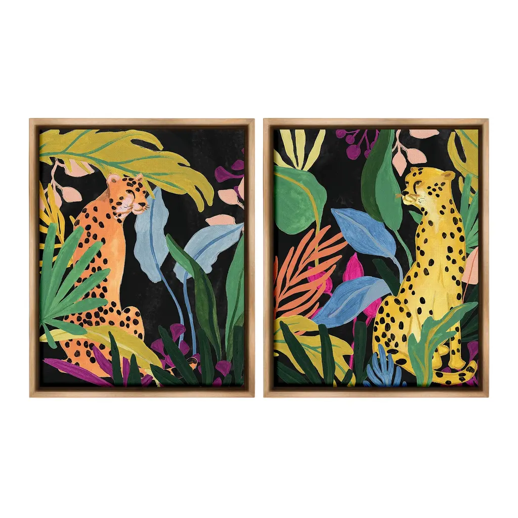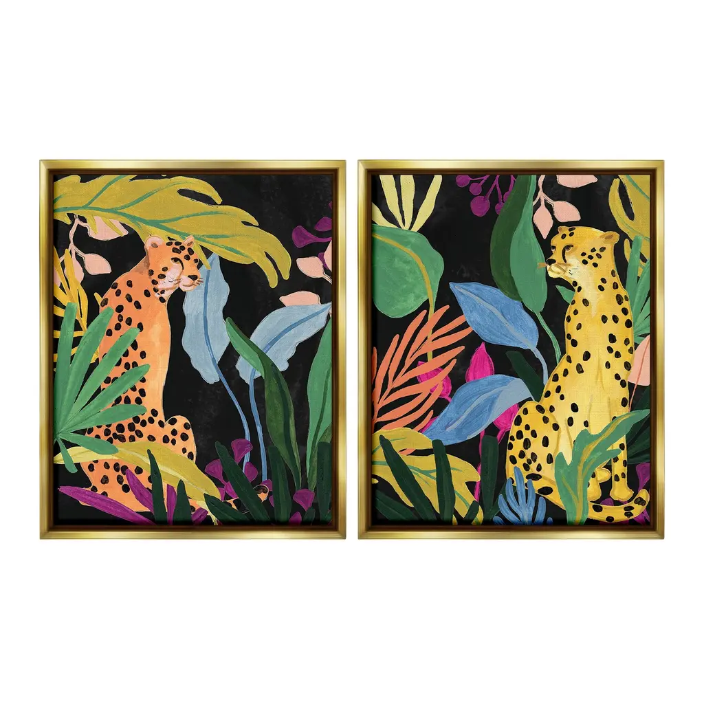 Elevate your home or office to the next level with Stupell Framed Floating Canvas Wall Art. Our premium hand-stretched canvas is mounted securely into a sturdy lightweight frame. The museum-style gap between the wrapped canvas and the box frame gives the illusion of floating artwork. Stupell Wall Art is made in the USA.Features: Dimensions: 2 Piece Set, Each Frame is 17 x 1.7 x 21Two Piece Floater Framed Canvas are available as 17x21 or 25x31 Panels. All Floater Frame Products have a 1.7" Depth.Wall Art is Ready to Hang with Hardware Free Hanging. No Installation required. For Easy Set Up Lean or Layer Artwork on Shelf or Against Wall. Artwork is Permently Fixed into the Frame.Our elevated 1.7" Thick Floating Frame is the perfect complement to our canvas style Wall Art. We use only the highest quality inks in house with industry leading printing solutions. Canvas is hand stretched over a durable wood foundation and then mounted securly into a Modern Box Frame. Made in the USA.Artwork Relates To: Plant, Vegetation, Animal, Cheetah, Mammal, Wildlife, Jungle, Nature, Botanical, Tropical, LeopardDesign by June Erica Vess