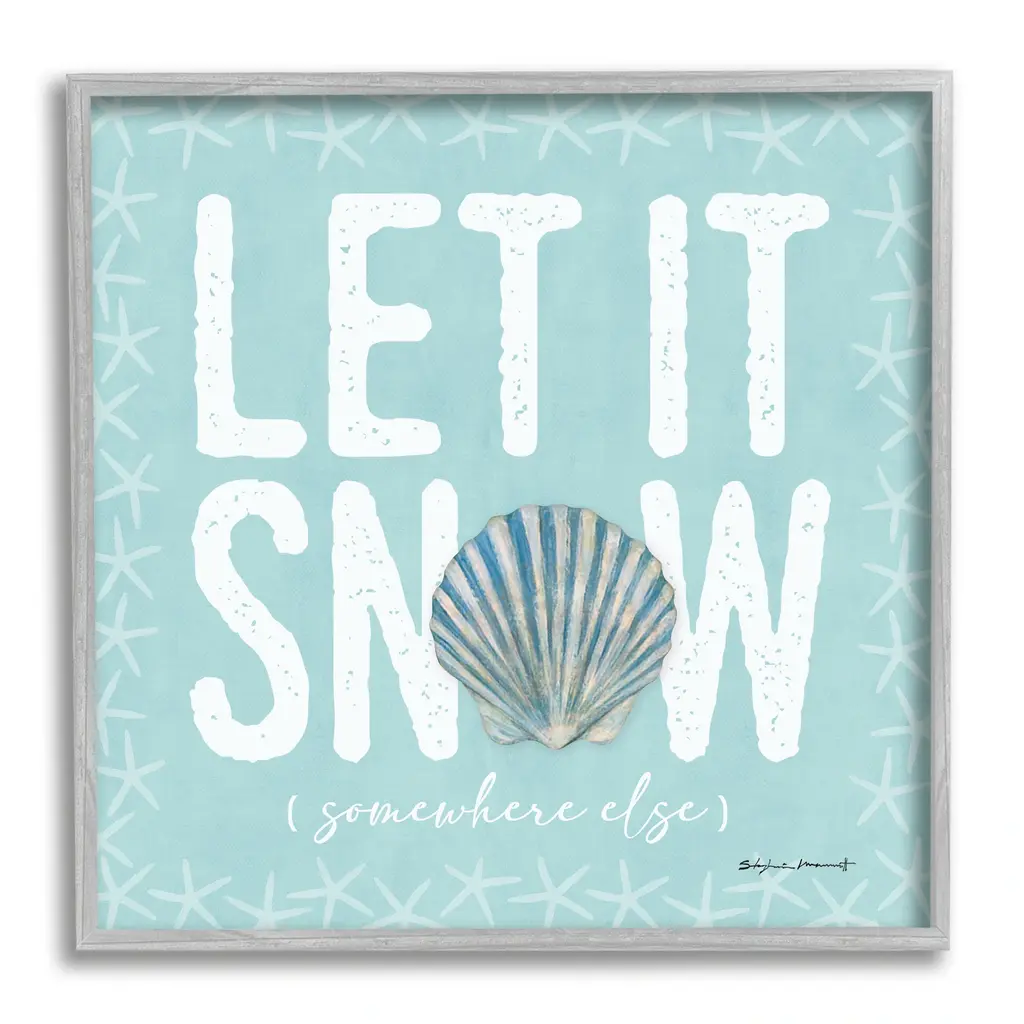 Add dimension to any room with our textured Framed Giclee Artwork. Our framed artwork is securely mounted into a 1.5-inch thick wood grain frame and ready to hang. Frames are available in three alluring styles: black, gray farmhouse and white. In addition, you should check out our oversized options if you want a statement piece. Stupell Wall Art is made in the USA.Features: Dimensions: 12 x 1.5 x 12 FramedFramed Giclee Sizes Include Standard: 12 x 1.5 x 12 Large: 17 x 1.5 x 17 Oversized: 24 x 1.5 x 24Wall Art is Ready to Hang - No Installation or Hardware Needed. For Easy Set Up Lean or Layer Artwork on Shelf or Against Wall.Our giclée prints are carefully mounted on a durable MDF backing, and then perfectly finished in a 1.5 inch thick woodgrain frame. Mounted frame colors include black, gray farmhouse and white. Made In USA.Artwork Relates To: Sea Life, Clam, Nautical, Starfish, Turquoise, Christmas, Holiday, Winter, Let It Snow Somewhere ElseDesign by Stephanie Workman Marrott