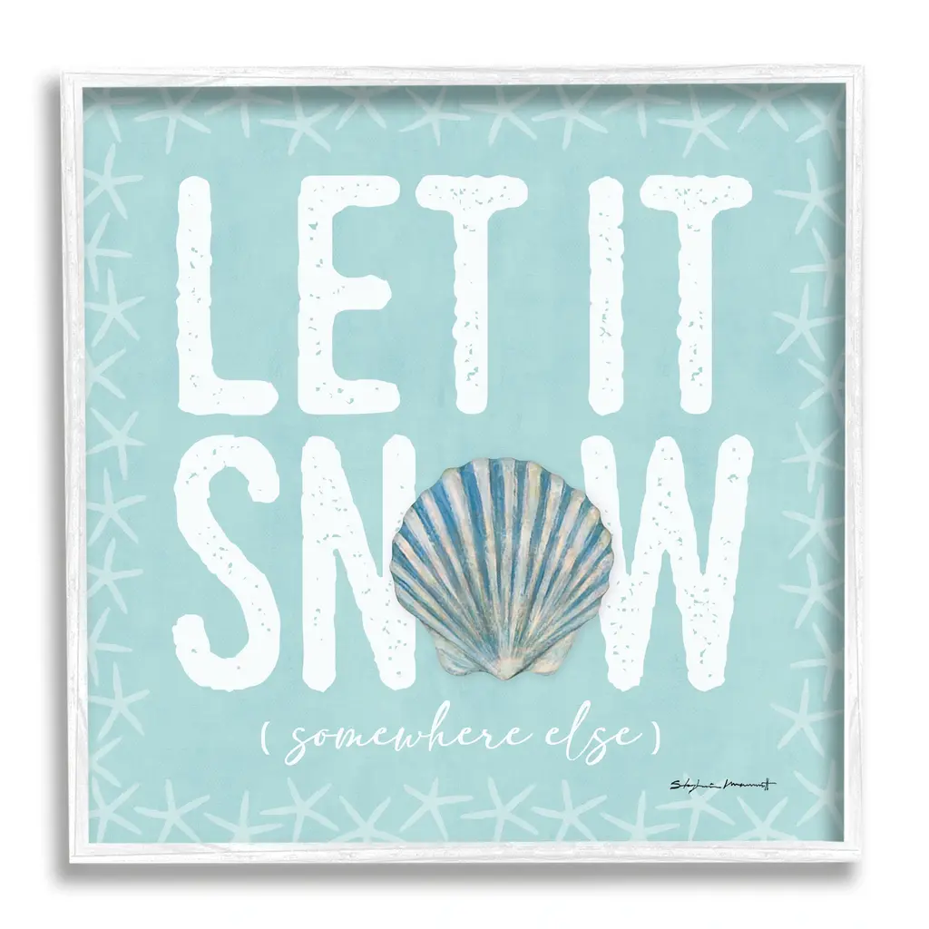 Add dimension to any room with our textured Framed Giclee Artwork. Our framed artwork is securely mounted into a 1.5-inch thick wood grain frame and ready to hang. Frames are available in three alluring styles: black, gray farmhouse and white. In addition, you should check out our oversized options if you want a statement piece. Stupell Wall Art is made in the USA.Features: Dimensions: 12 x 1.5 x 12 FramedFramed Giclee Sizes Include Standard: 12 x 1.5 x 12 Large: 17 x 1.5 x 17 Oversized: 24 x 1.5 x 24Wall Art is Ready to Hang - No Installation or Hardware Needed. For Easy Set Up Lean or Layer Artwork on Shelf or Against Wall.Our giclée prints are carefully mounted on a durable MDF backing, and then perfectly finished in a 1.5 inch thick woodgrain frame. Mounted frame colors include black, gray farmhouse and white. Made In USA.Artwork Relates To: Sea Life, Clam, Nautical, Starfish, Turquoise, Christmas, Holiday, Winter, Let It Snow Somewhere ElseDesign by Stephanie Workman Marrott