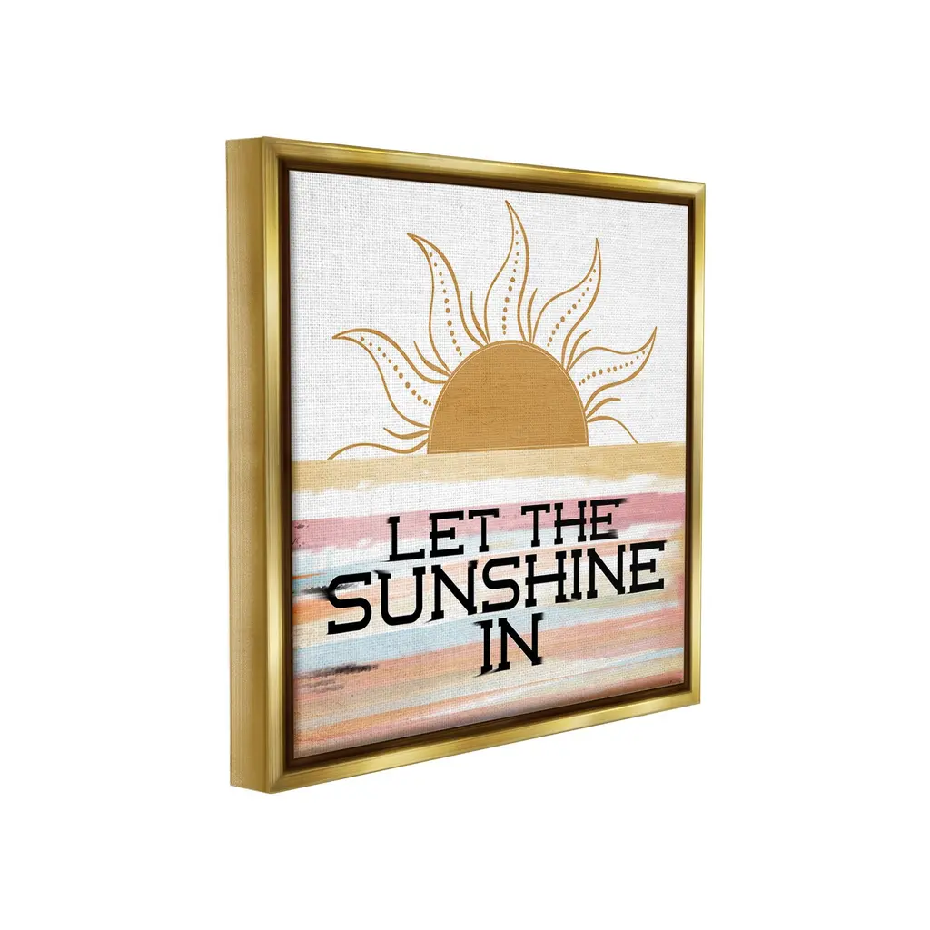 Elevate your home or office to the next level with Stupell Framed Floating Canvas Wall Art. Our premium hand-stretched canvas is mounted securely into a sturdy lightweight frame. The museum-style gap between the wrapped canvas and the box frame gives the illusion of floating artwork. Stupell Wall Art is made in the USA.Features: Dimensions: 18 x 1.7 x 18 Frame, 17 x 1.5 x 17 Canvas ArtFloating Frame Canvas Products are available in sizes 18"x18" and 25"x25". All Floating Frame Canvas Products have a 1.7" Depth.Wall Art is Ready to Hang with Hardware Free Hanging. No Installation required. For Easy Set Up Lean or Layer Artwork on Shelf or Against Wall. Artwork is Permently Fixed into the Frame.Our elevated 1.7" Thick Floating Frame is the perfect complement to our canvas style Wall Art. We use only the highest quality inks in house with industry leading printing solutions. Canvas is hand stretched over a durable wood foundation and then mounted securly into a Modern Box Frame. Made in the USA.Artwork Relates To: Sun, Rays, Beach, Ocean, Sea, Inspirational, Abstract, Let The Sunshine InDesign by Kim Allen