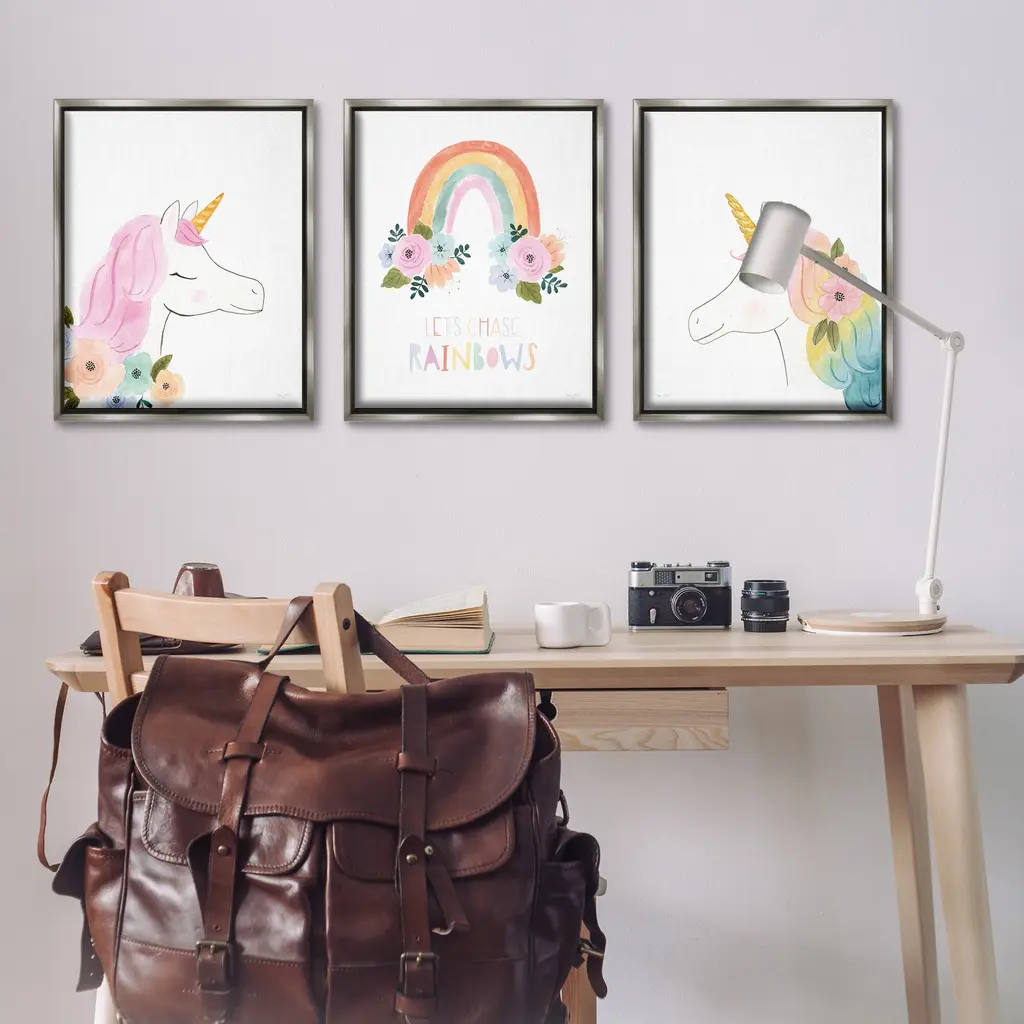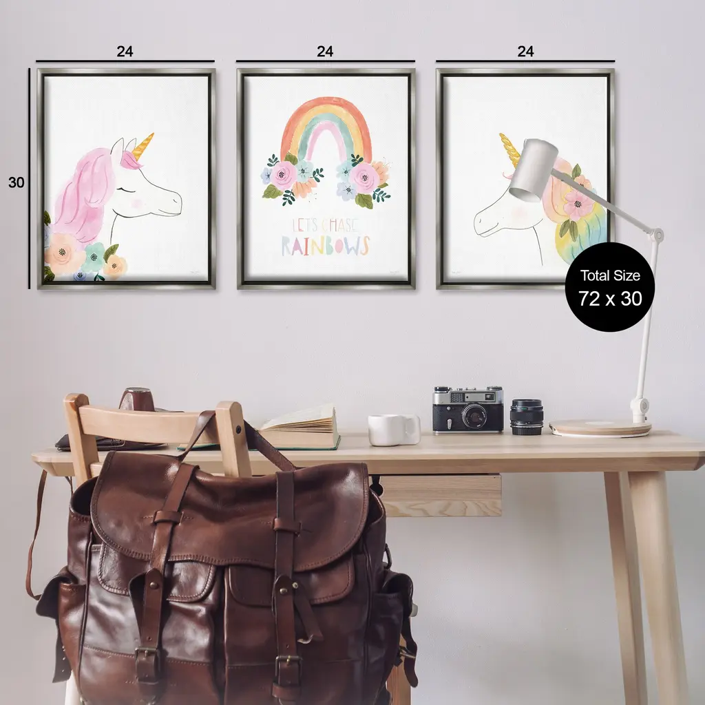 Stupell Let's Chase Rainbows Unicorns Framed Floater Canvas Wall Art Design By Jenaya Jackson (Set Of 3) - 25 X 31 - Grey