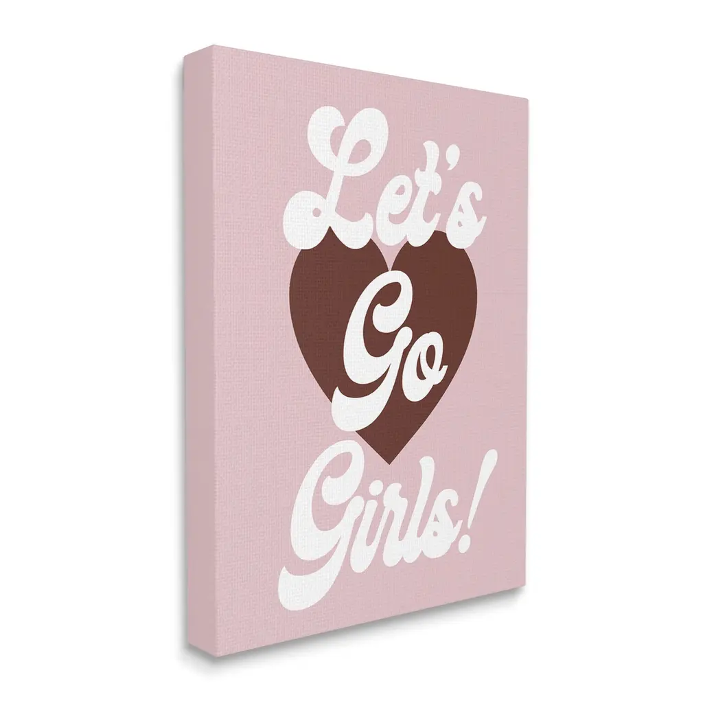 We create our stretched canvas to the highest standards. Using only the highest quality inks and canvas on Mimaki printers, we hand-cut and stretch each piece over a 1.5-inch thick wooden frame for hanging. As a result, the art comes ready to hang on the sturdy ledge with no installation required. Stupell Wall Art is made in the USA.Features: Dimensions: 16 x 1.5 x 20 InchesStretched Canvas Sizes Include Standard: 16 x 1.5 x 20 Large: 20 x 1.5 x 30 X-Large: 30 x 1.5 x 40 Oversized: 36 x 1.5 x 48Wall Art is Ready to Hang with Hardware Free Hanging. No installation required. For Easy Set Up Lean or Layer Artwork on Shelf or Against Wall.Our stretched canvas is created with the highest standards. We use only the highest quality inks and canvas on our in house Mimaki printers, and then hand cut and stretch each piece over a 1.5 inch thick wooden frame for hanging. Made In USA.Artwork Relates To: Phrase, Pink, Heart, Let's Go Girls!Design by Lil' Rue