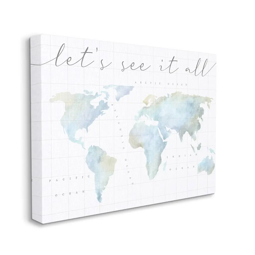 We create our stretched canvas to the highest standards. Using only the highest quality inks and canvas on Mimaki printers, we hand-cut and stretch each piece over a 1.5-inch thick wooden frame for hanging. As a result, the art comes ready to hang on the sturdy ledge with no installation required. Stupell Wall Art is made in the USA.Features: Dimensions: 20 x 1.5 x 16 InchesStretched Canvas Sizes Include Standard: 20 x 1.5 x 16 Large: 30 x 1.5 x 20 X-Large: 40 x 1.5 x 30 Oversized: 48 x 1.5 x 36Wall Art is Ready to Hang - No Installation or Hardware Needed. For Easy Set Up Lean or Layer Artwork on Shelf or Against Wall.Our stretched canvas is created with the highest standards. We use only the highest quality inks and canvas on our in house Mimaki printers, and then hand cut and stretch each piece over a 1.5 inch thick wooden frame for hanging. Made In USA.Artwork Relates To: World Map, Diagram, Chart, Earth, Travel, Adventure, Let's See It AllDesign by Lil' Rue