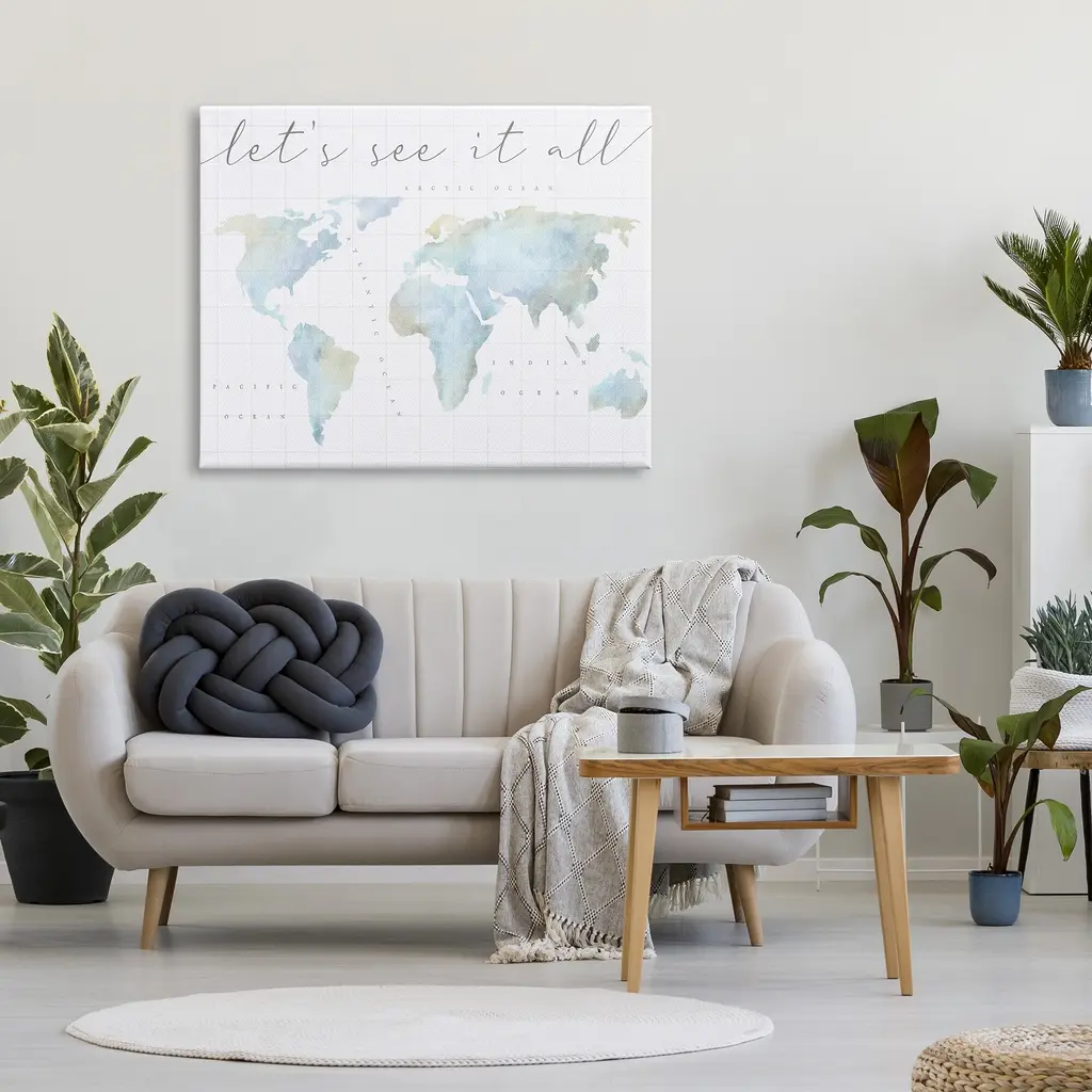 We create our stretched canvas to the highest standards. Using only the highest quality inks and canvas on Mimaki printers, we hand-cut and stretch each piece over a 1.5-inch thick wooden frame for hanging. As a result, the art comes ready to hang on the sturdy ledge with no installation required. Stupell Wall Art is made in the USA.Features: Dimensions: 20 x 1.5 x 16 InchesStretched Canvas Sizes Include Standard: 20 x 1.5 x 16 Large: 30 x 1.5 x 20 X-Large: 40 x 1.5 x 30 Oversized: 48 x 1.5 x 36Wall Art is Ready to Hang - No Installation or Hardware Needed. For Easy Set Up Lean or Layer Artwork on Shelf or Against Wall.Our stretched canvas is created with the highest standards. We use only the highest quality inks and canvas on our in house Mimaki printers, and then hand cut and stretch each piece over a 1.5 inch thick wooden frame for hanging. Made In USA.Artwork Relates To: World Map, Diagram, Chart, Earth, Travel, Adventure, Let's See It AllDesign by Lil' Rue