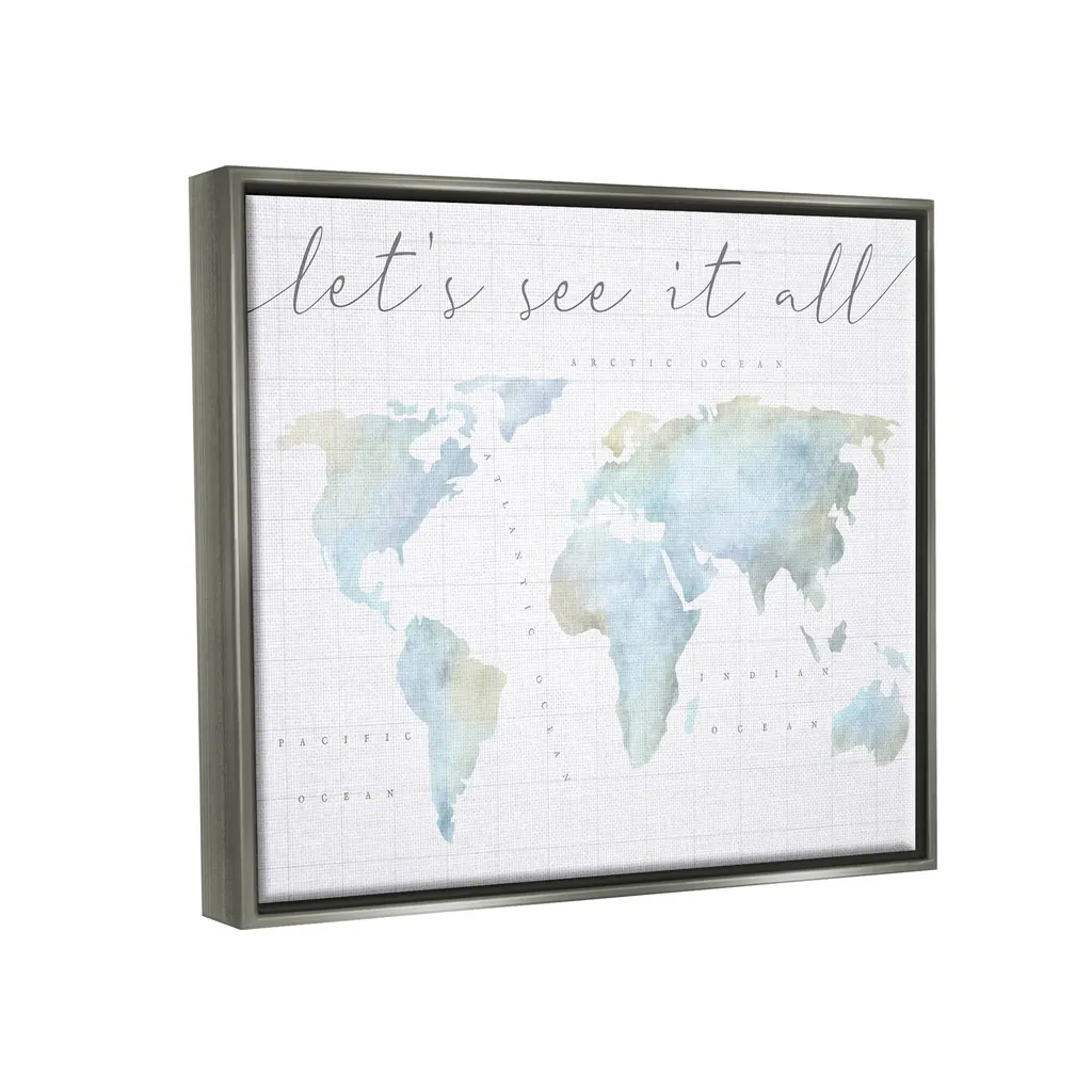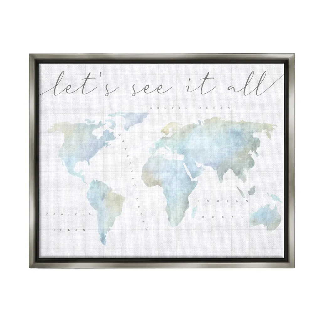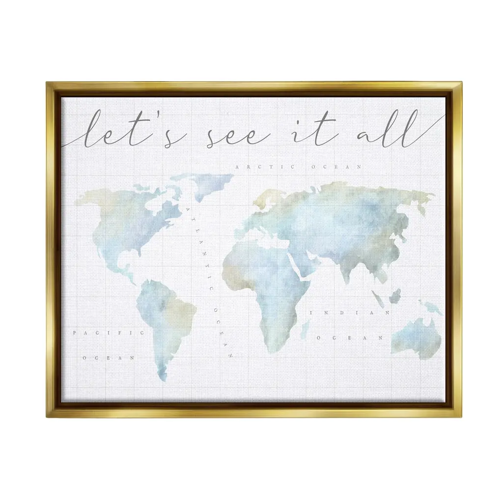 Elevate your home or office to the next level with Stupell Framed Floating Canvas Wall Art. Our premium hand-stretched canvas is mounted securely into a sturdy lightweight frame. The museum-style gap between the wrapped canvas and the box frame gives the illusion of floating artwork. Stupell Wall Art is made in the USA.Features: Dimensions: 21 x 1.7 x 17 Frame, 20 x 1.5 x 16 Canvas ArtFloating Frame Sizes Include Standard: 21 x 1.7 x 17 Oversized: 31 x 1.7 x 25Wall Art is Ready to Hang - No Installation or Hardware Needed. For Easy Set Up Lean or Layer Artwork on Shelf or Against Wall.Our elevated 1.7" Thick Floating Frame is the perfect complement to our canvas style Wall Art. We use only the highest quality inks in house with industry leading printing solutions. Canvas is hand stretched over a durable wood foundation and then mounted securly into a Modern Box Frame. Made in the USA.Artwork Relates To: World Map, Diagram, Chart, Earth, Travel, Adventure, Let's See It AllDesign by Lil' Rue