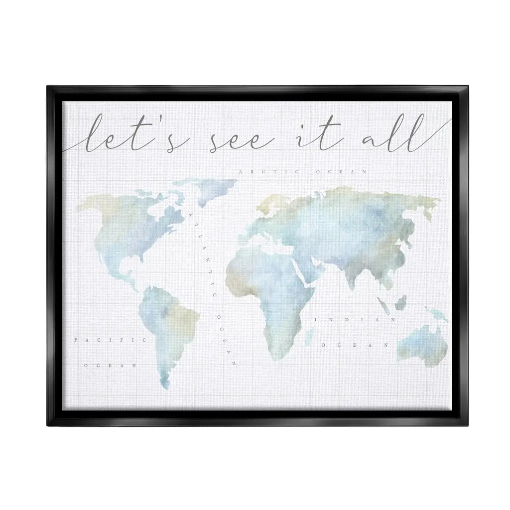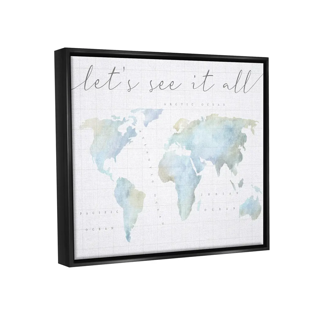 Elevate your home or office to the next level with Stupell Framed Floating Canvas Wall Art. Our premium hand-stretched canvas is mounted securely into a sturdy lightweight frame. The museum-style gap between the wrapped canvas and the box frame gives the illusion of floating artwork. Stupell Wall Art is made in the USA.Features: Dimensions: 21 x 1.7 x 17 Frame, 20 x 1.5 x 16 Canvas ArtFloating Frame Sizes Include Standard: 21 x 1.7 x 17 Oversized: 31 x 1.7 x 25Wall Art is Ready to Hang - No Installation or Hardware Needed. For Easy Set Up Lean or Layer Artwork on Shelf or Against Wall.Our elevated 1.7" Thick Floating Frame is the perfect complement to our canvas style Wall Art. We use only the highest quality inks in house with industry leading printing solutions. Canvas is hand stretched over a durable wood foundation and then mounted securly into a Modern Box Frame. Made in the USA.Artwork Relates To: World Map, Diagram, Chart, Earth, Travel, Adventure, Let's See It AllDesign by Lil' Rue