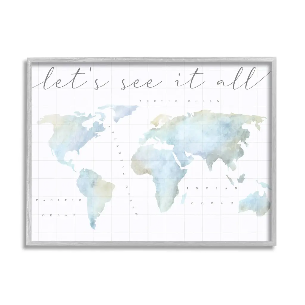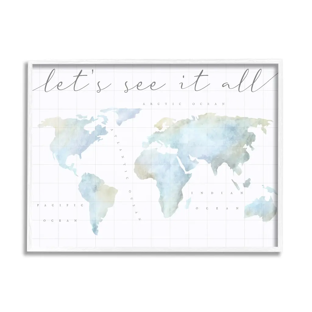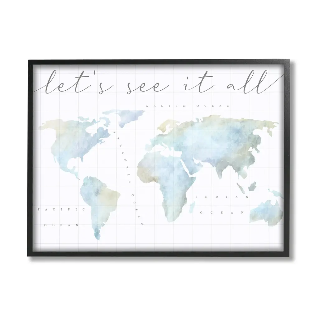 Add dimension to any room with our textured Framed Giclee Artwork. Our framed artwork is securely mounted into a 1.5-inch thick wood grain frame and ready to hang. Frames are available in three alluring styles: black, gray farmhouse and white. In addition, you should check out our oversized options if you want a statement piece. Stupell Wall Art is made in the USA.Features: Dimensions: 14 x 1.5 x 11 FramedFramed Giclee Sizes Include Standard: 14 x 1.5 x 11 Large: 20 x 1.5 x 16 Oversized: 30 x 1.5 x 24Wall Art is Ready to Hang - No Installation or Hardware Needed. For Easy Set Up Lean or Layer Artwork on Shelf or Against Wall.Our giclée prints are carefully mounted on a durable MDF backing, and then perfectly finished in a 1.5 inch thick woodgrain frame. Mounted frame colors include black, gray farmhouse and white. Made In USA.Artwork Relates To: World Map, Diagram, Chart, Earth, Travel, Adventure, Let's See It AllDesign by Lil' Rue