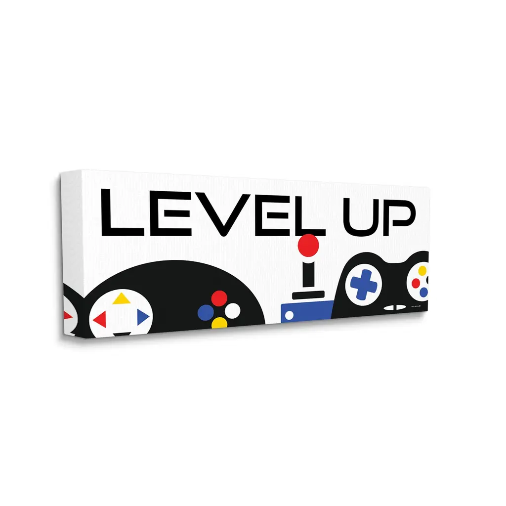 Proudly made in the USA, Our stretched canvas is created with the highest standards. We use only the highest quality inks and canvas on our in house Mimaki printers, and then hand cut and stretch each piece over a 1.5 inch thick wooden frame for hanging. The art comes ready to hang with no installation required. Room Type: Children's Room, Nursery, Playroom, Classroom or Kid's Bedroom.Features: Dimensions: 24 x 1.5 x 10 InchesStretched Canvas Sizes Include Standard: 24 x 1.5 x 10 Large: 30 x 1.5 x 13 X-Large: 40 x 1.5 x 17 Oversized: 48 x 1.5 x 20Wall Art is Ready to Hang - No Installation or Hardware Needed. For Easy Set Up Lean or Layer Artwork on Shelf or Against Wall.Our stretched canvas is created with the highest standards. We use only the highest quality inks and canvas on our in house Mimaki printers, and then hand cut and stretch each piece over a 1.5 inch thick wooden frame for hanging. Made In USA.Artwork Relates To: Symbol, Electronics, Controller, Joystick, Gaming, Video Game, Level UpDesign by Yass Naffas Designs