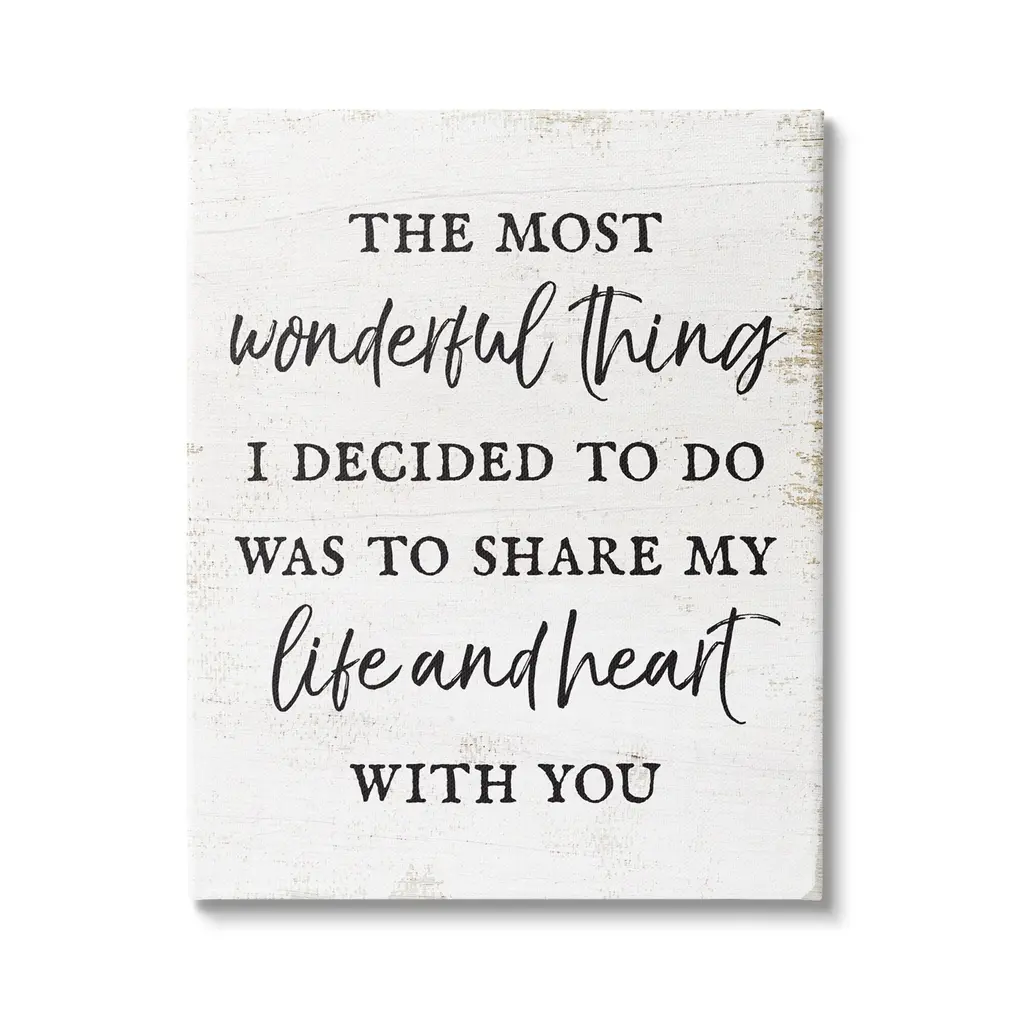 We create our stretched canvas to the highest standards. Using only the highest quality inks and canvas on Mimaki printers, we hand-cut and stretch each piece over a 1.5-inch thick wooden frame for hanging. As a result, the art comes ready to hang on the sturdy ledge with no installation required. Stupell Wall Art is made in the USA.Features: Dimensions: 16 x 1.5 x 20 InchesStretched Canvas Sizes Include Standard: 16 x 1.5 x 20 Large: 20 x 1.5 x 30 X-Large: 30 x 1.5 x 40 Oversized: 36 x 1.5 x 48Wall Art is Ready to Hang - No Installation or Hardware Needed. For Easy Set Up Lean or Layer Artwork on Shelf or Against Wall.Our stretched canvas is created with the highest standards. We use only the highest quality inks and canvas on our in house Mimaki printers, and then hand cut and stretch each piece over a 1.5 inch thick wooden frame for hanging. Made In USA.Artwork Relates To: Romance, Rustic, Love, Romantic, The Most Wonderful Thing I Decided To Do Was To Share My Life And Heart With YouDesign by Lil' Rue