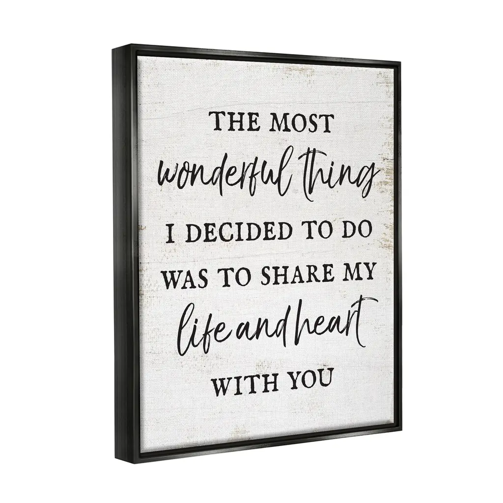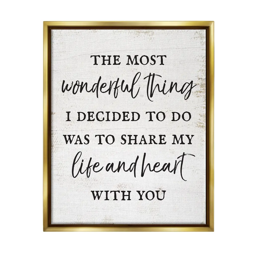 Elevate your home or office to the next level with Stupell Framed Floating Canvas Wall Art. Our premium hand-stretched canvas is mounted securely into a sturdy lightweight frame. The museum-style gap between the wrapped canvas and the box frame gives the illusion of floating artwork. Stupell Wall Art is made in the USA.Features: Dimensions: 17 x 1.7 x 21 Frame, 16 x 1.5 x 20 Canvas ArtFloating Frame Sizes Include Standard: 17 x 1.7 x 21 Oversized: 25 x 1.7 x 31Wall Art is Ready to Hang - No Installation or Hardware Needed. For Easy Set Up Lean or Layer Artwork on Shelf or Against Wall.Our elevated 1.7" Thick Floating Frame is the perfect complement to our canvas style Wall Art. We use only the highest quality inks in house with industry leading printing solutions. Canvas is hand stretched over a durable wood foundation and then mounted securly into a Modern Box Frame. Made in the USA.Artwork Relates To: Romance, Rustic, Love, Romantic, The Most Wonderful Thing I Decided To Do Was To Share My Life And Heart With YouDesign by Lil' Rue