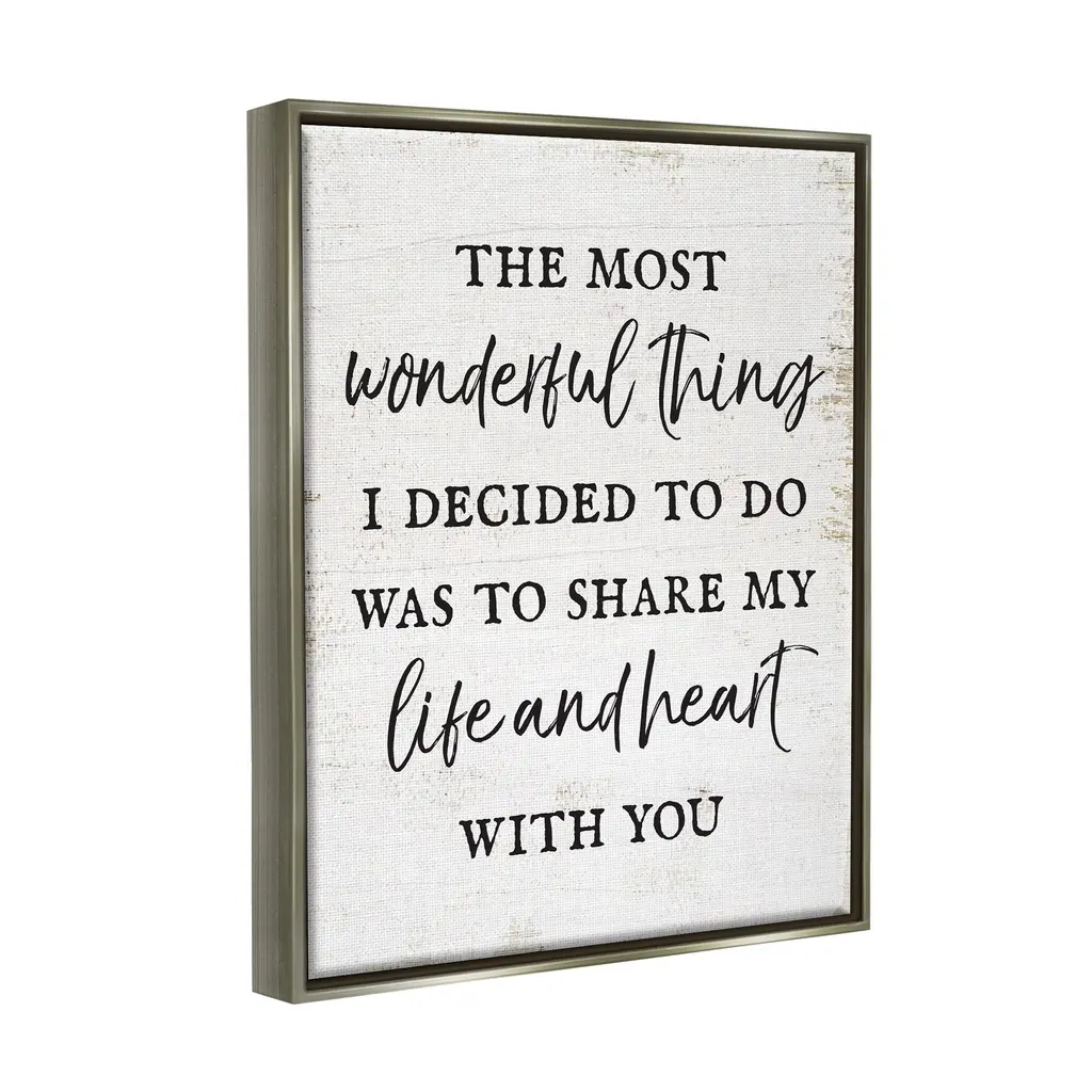 Elevate your home or office to the next level with Stupell Framed Floating Canvas Wall Art. Our premium hand-stretched canvas is mounted securely into a sturdy lightweight frame. The museum-style gap between the wrapped canvas and the box frame gives the illusion of floating artwork. Stupell Wall Art is made in the USA.Features: Dimensions: 17 x 1.7 x 21 Frame, 16 x 1.5 x 20 Canvas ArtFloating Frame Sizes Include Standard: 17 x 1.7 x 21 Oversized: 25 x 1.7 x 31Wall Art is Ready to Hang - No Installation or Hardware Needed. For Easy Set Up Lean or Layer Artwork on Shelf or Against Wall.Our elevated 1.7" Thick Floating Frame is the perfect complement to our canvas style Wall Art. We use only the highest quality inks in house with industry leading printing solutions. Canvas is hand stretched over a durable wood foundation and then mounted securly into a Modern Box Frame. Made in the USA.Artwork Relates To: Romance, Rustic, Love, Romantic, The Most Wonderful Thing I Decided To Do Was To Share My Life And Heart With YouDesign by Lil' Rue