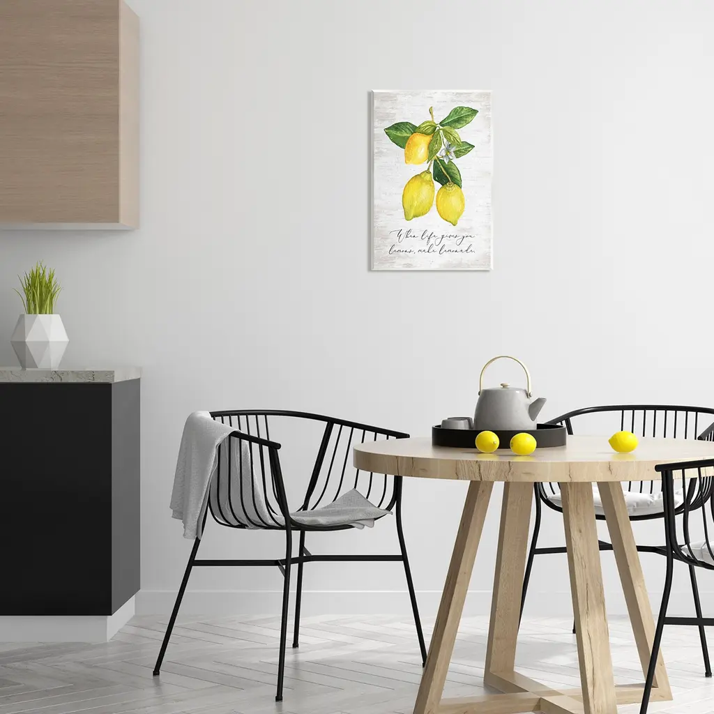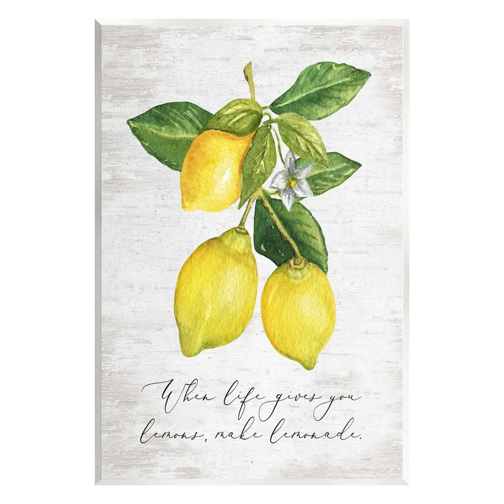 Our wall plaques start as high-quality lithograph prints mounted on durable 0.5-inch thick MDF wood. Each piece is hand finished and comes with a fresh layer of white foil on the sides to give it a crisp, clean look. Plaques arrive ready to hang without installation and come with removable plastic corners to keep them from damage in transit. Stupell Wall Art is made in the USA.Features: Dimensions: 10 x 0.5 x 15 InchesWall Plaque Sizes Include Standard: 10 x 0.5 x 15 Oversized: 13 x 0.5 x 19Wall Art is Ready to Hang with Hardware Free Hanging. No installation required. For Easy Set Up Lean or Layer Artwork on Shelf or Against Wall.All of our wall plaques start off as high quality lithograph prints that are then mounted on durable 0.5 inch thick MDF wood. Each piece is hand finished and comes with a fresh layer of foil on the sides to give it a crisp clean look. Made In USA.Artwork Relates To: Citrus Fruit, Food, Fruit, Lemon, Plant, Produce, Leaf, Kitchen, When Life Gives You Lemons Make LemonadeDesign by Lettered and Lined