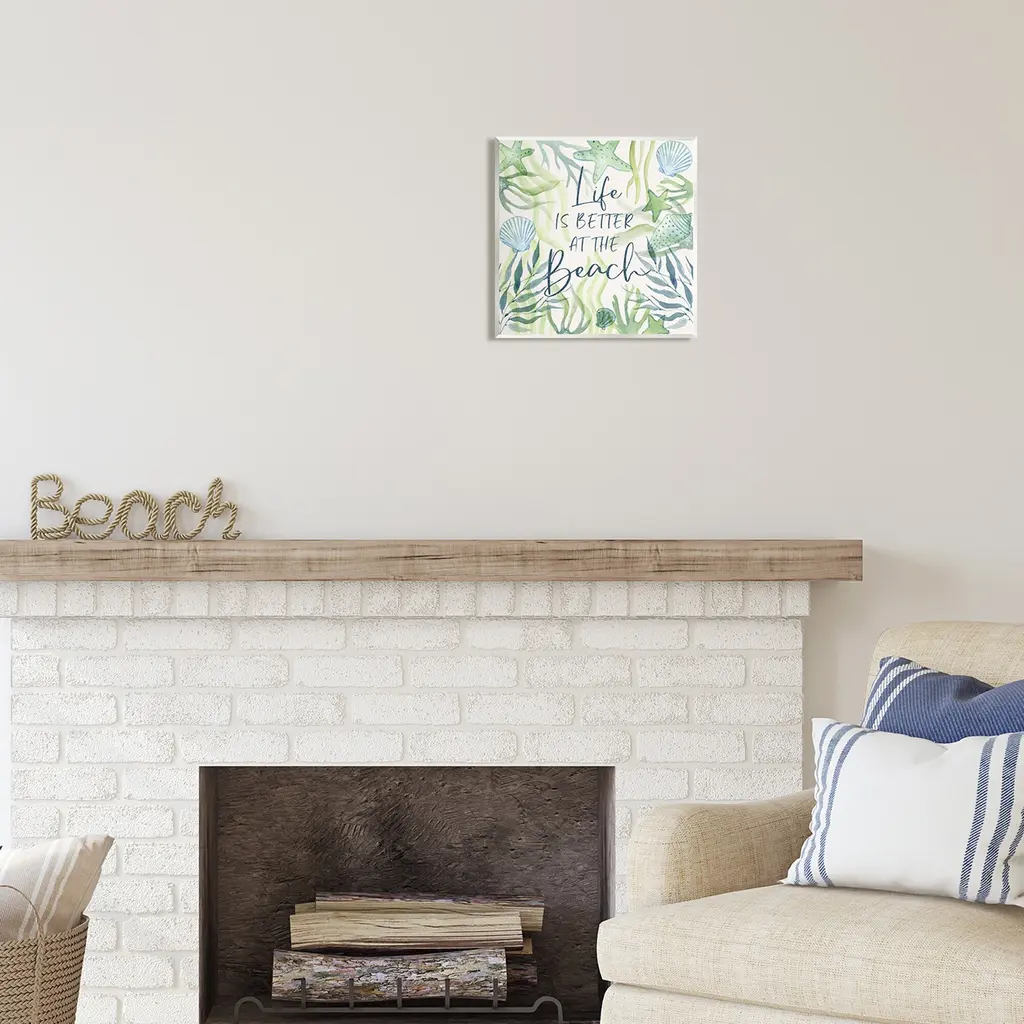 Our wall plaques start as high-quality lithograph prints mounted on durable 0.5-inch thick MDF wood. Each piece is hand finished and comes with a fresh layer of white foil on the sides to give it a crisp, clean look. Plaques arrive ready to hang without installation and come with removable plastic corners to keep them from damage in transit. Stupell Industries Wall Art is made in the USA.Features: Dimensions: 12 x 0.5 x 12 InchesWall Art is Ready to Hang with Hardware Free Hanging. No installation required. For Easy Set Up Lean or Layer Artwork on Shelf or Against Wall.All of our wall plaques start off as high quality lithograph prints that are then mounted on durable 0.5 inch thick MDF wood. Each piece is hand finished and comes with a fresh layer of foil on the sides to give it a crisp clean look. Made In USA.Artwork Relates To: Phrase, Sea Life, Seashell, Starfish, Seaweed, Nautical, Life is Better at the BeachDesign by Janet Tava