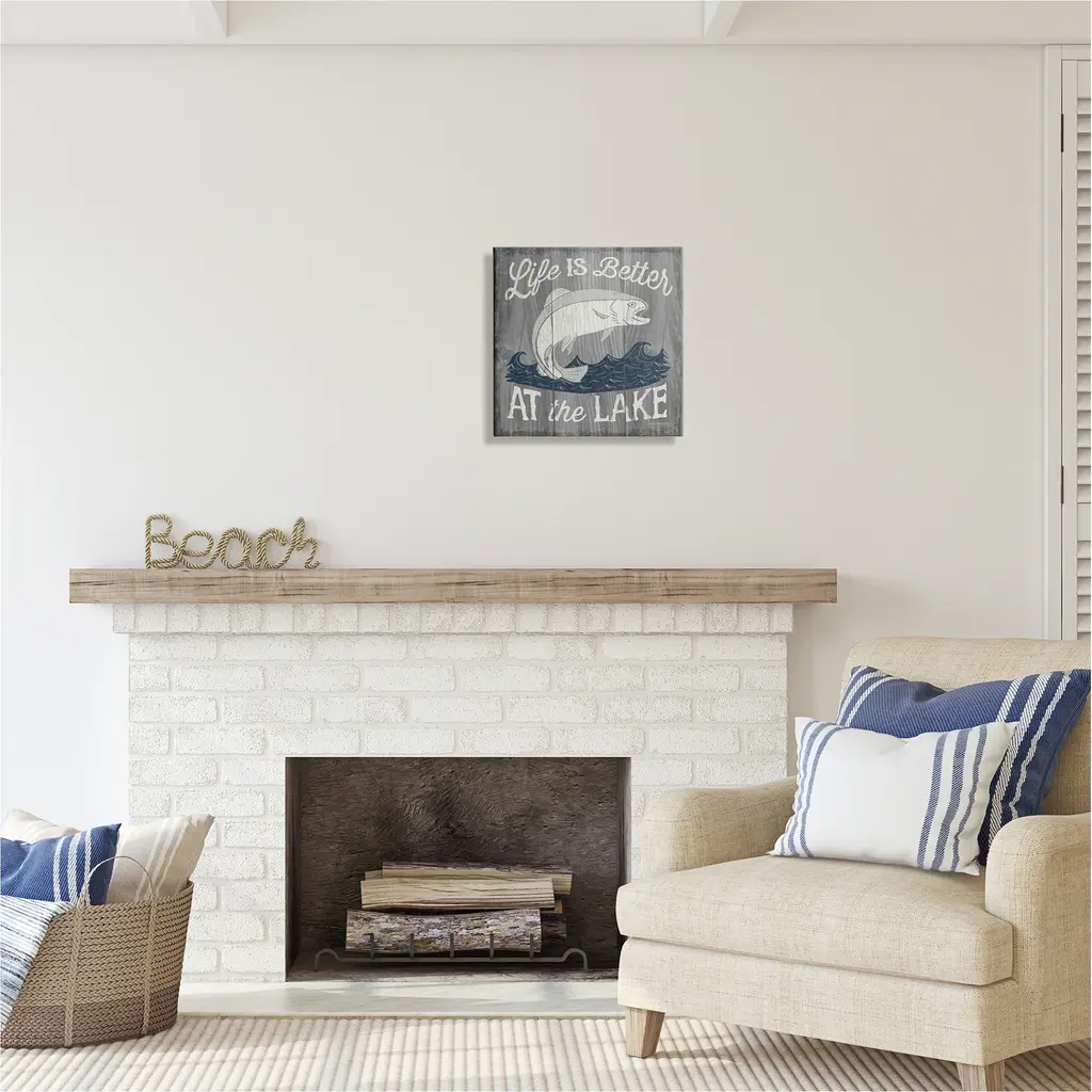 We create our stretched canvas to the highest standards. Using only the highest quality inks and canvas on Mimaki printers, we hand-cut and stretch each piece over a 1.5-inch thick wooden frame for hanging. As a result, the art comes ready to hang on the sturdy ledge with no installation required. Stupell Wall Art is made in the USA.Features: Dimensions: 17 x 1.5 x 17 InchesStretched Canvas Sizes Include Standard: 17 x 1.5 x 17 Large: 24 x 1.5 x 24 X-Large: 30 x 1.5 x 30 Oversized: 36 x 1.5 x 36Wall Art is Ready to Hang with Hardware Free Hanging. No installation required. For Easy Set Up Lean or Layer Artwork on Shelf or Against Wall.Our stretched canvas is created with the highest standards. We use only the highest quality inks and canvas on our in house Mimaki printers, and then hand cut and stretch each piece over a 1.5 inch thick wooden frame for hanging. Made In USA.Artwork Relates To: Fish, Fishing, Lake, Rustic, Life is Better at the LakeDesign by Laura Marshall