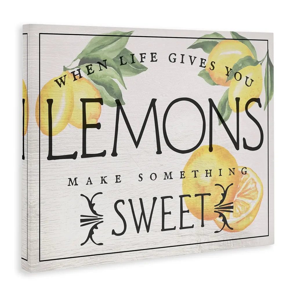 Proudly made in the USA, Our stretched canvas is created with the highest standards. We use only the highest quality inks and canvas on our in house Mimaki printers, and then hand cut and stretch each piece over a 1.5 inch thick wooden frame for hanging. The art comes ready to hang with no installation required. Not to mention, at this size, it is sure to be the focal point of any room!Features: Wall Art is Ready to Hang - No Installation or Hardware Needed. For Easy Set Up Lean or Layer Artwork on Shelf or Against Wall.Our stretched canvas is created with the highest standards. We use only the highest quality inks and canvas on our in house Mimaki printers, and then hand cut and stretch each piece over a 1.5 inch thick wooden frame for hanging. Made In USA.Artwork Relates To: Lemons, Citrus, Phrase, TypographyDesign by Daphne Polselli