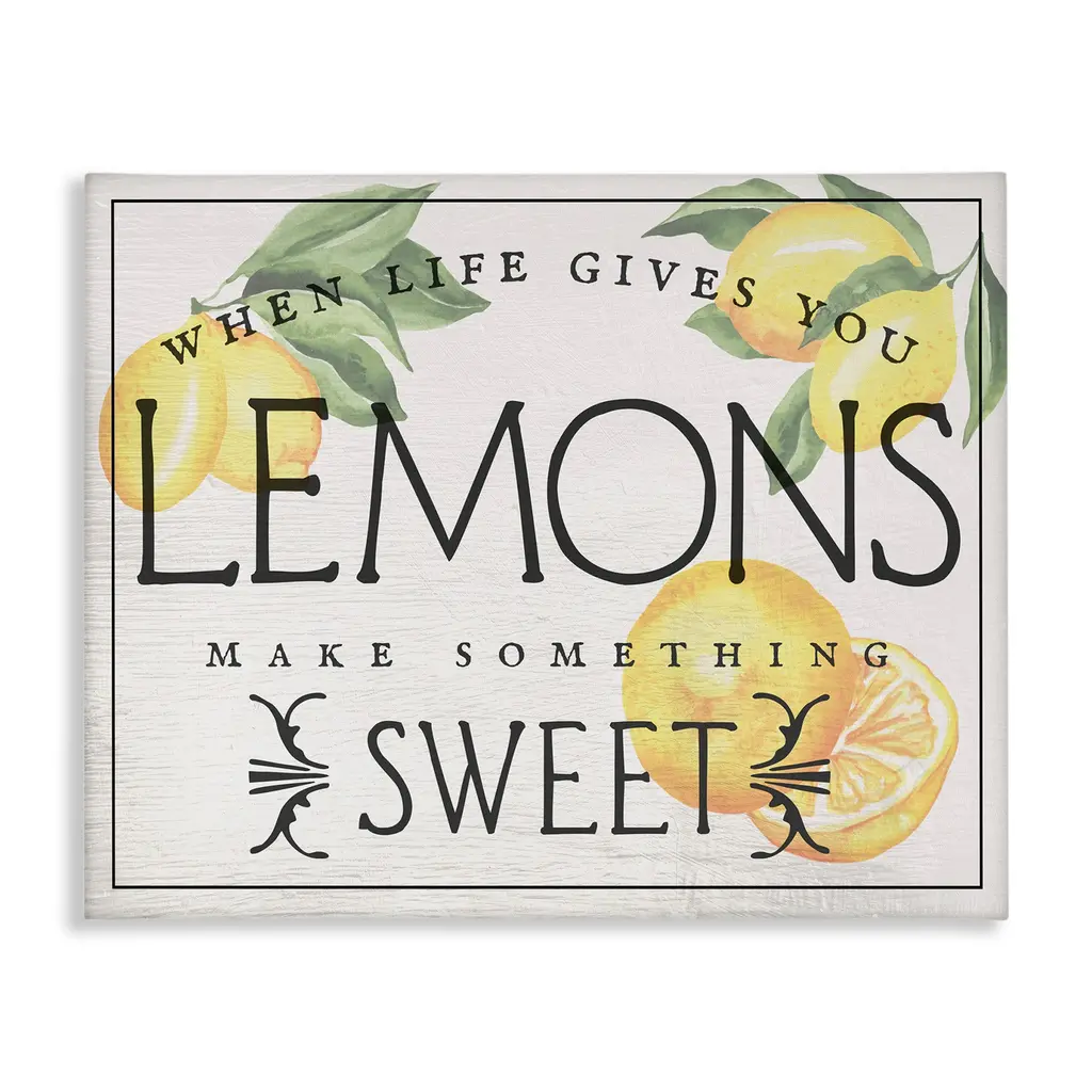 Proudly made in the USA, Our stretched canvas is created with the highest standards. We use only the highest quality inks and canvas on our in house Mimaki printers, and then hand cut and stretch each piece over a 1.5 inch thick wooden frame for hanging. The art comes ready to hang with no installation required. Not to mention, at this size, it is sure to be the focal point of any room!Features: Wall Art is Ready to Hang - No Installation or Hardware Needed. For Easy Set Up Lean or Layer Artwork on Shelf or Against Wall.Our stretched canvas is created with the highest standards. We use only the highest quality inks and canvas on our in house Mimaki printers, and then hand cut and stretch each piece over a 1.5 inch thick wooden frame for hanging. Made In USA.Artwork Relates To: Lemons, Citrus, Phrase, TypographyDesign by Daphne Polselli