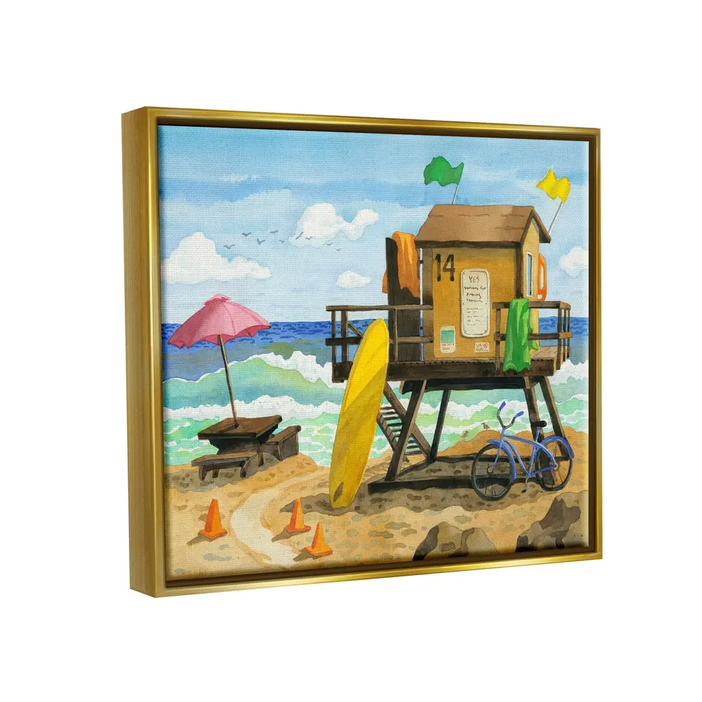Elevate your home or office to the next level with Stupell Framed Floating Canvas Wall Art. Our premium hand-stretched canvas is mounted securely into a sturdy lightweight frame. The museum-style gap between the wrapped canvas and the box frame gives the illusion of floating artwork. Stupell Wall Art is made in the USA.Features: Dimensions: 21 x 1.7 x 17 Frame, 20 x 1.5 x 16 Canvas ArtFloating Frame Sizes Include Standard: 21 x 1.7 x 17 Oversized: 31 x 1.7 x 25Wall Art is Ready to Hang with Hardware Free Hanging. No installation required. For Easy Set Up Lean or Layer Artwork on Shelf or Against Wall.Our elevated 1.7" Thick Floating Frame is the perfect complement to our canvas style Wall Art. We use only the highest quality inks in house with industry leading printing solutions. Canvas is hand stretched over a durable wood foundation and then mounted securly into a Modern Box Frame. Made in the USA.Artwork Relates To: Hut, Nature, Sea, Water, Beach, Coast, Shoreline, Lifeguard Hut, BicycleDesign by Robin Altman