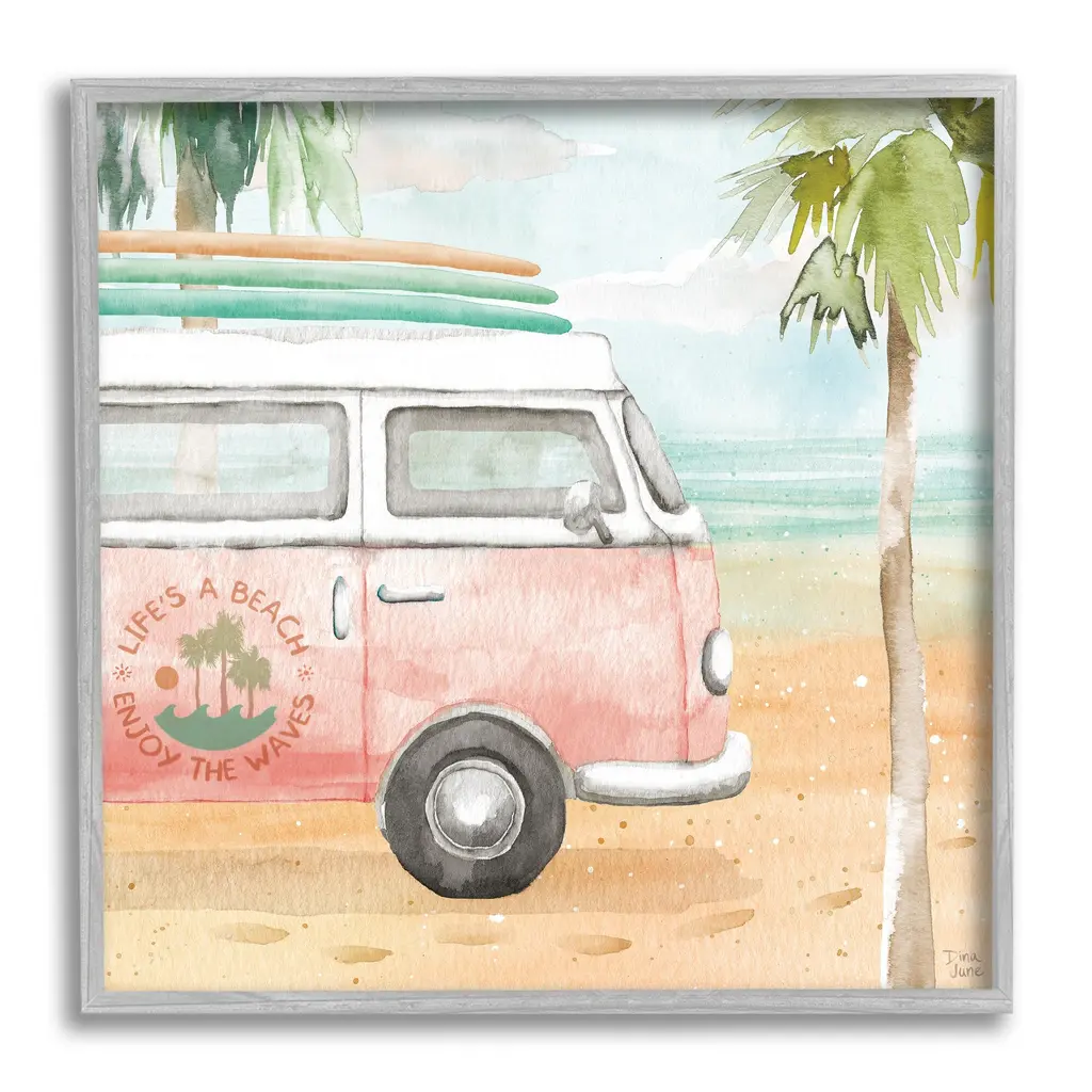 Our Framed Giclee Wall Art adds a touch of class to any space in your home or office. Frames are available in three alluring styles: black, gray farmhouse and white. Our textured artwork will add more depth and dimension to any space. Each piece is mounted with a 1.5 inch thick wood grain frame that is ready to hang! Looking for a statement piece? We have oversized artwork available.Features:Framed Giclee Sizes IncludeStandard: 12 x 1.5 x 12Large: 17 x 1.5 x 17Oversized: 24 x 1.5 x 24Wall Art is Ready to Hang - No Installation or Hardware Needed. For Easy Set Up Lean or Layer Artwork on Shelf or Against Wall.Artwork Relates To: Van, Transportation, Vehicle, Automobile, Palm Tree, Beach, Ocean, Water, VacationOur giclee prints are carefully mounted on a durable MDF backing, and then perfectly finished in a 1.5 inch thick woodgrain frame. Mounted frame colors include black, gray farmhouse and white. Made In USA.Design by Dina June