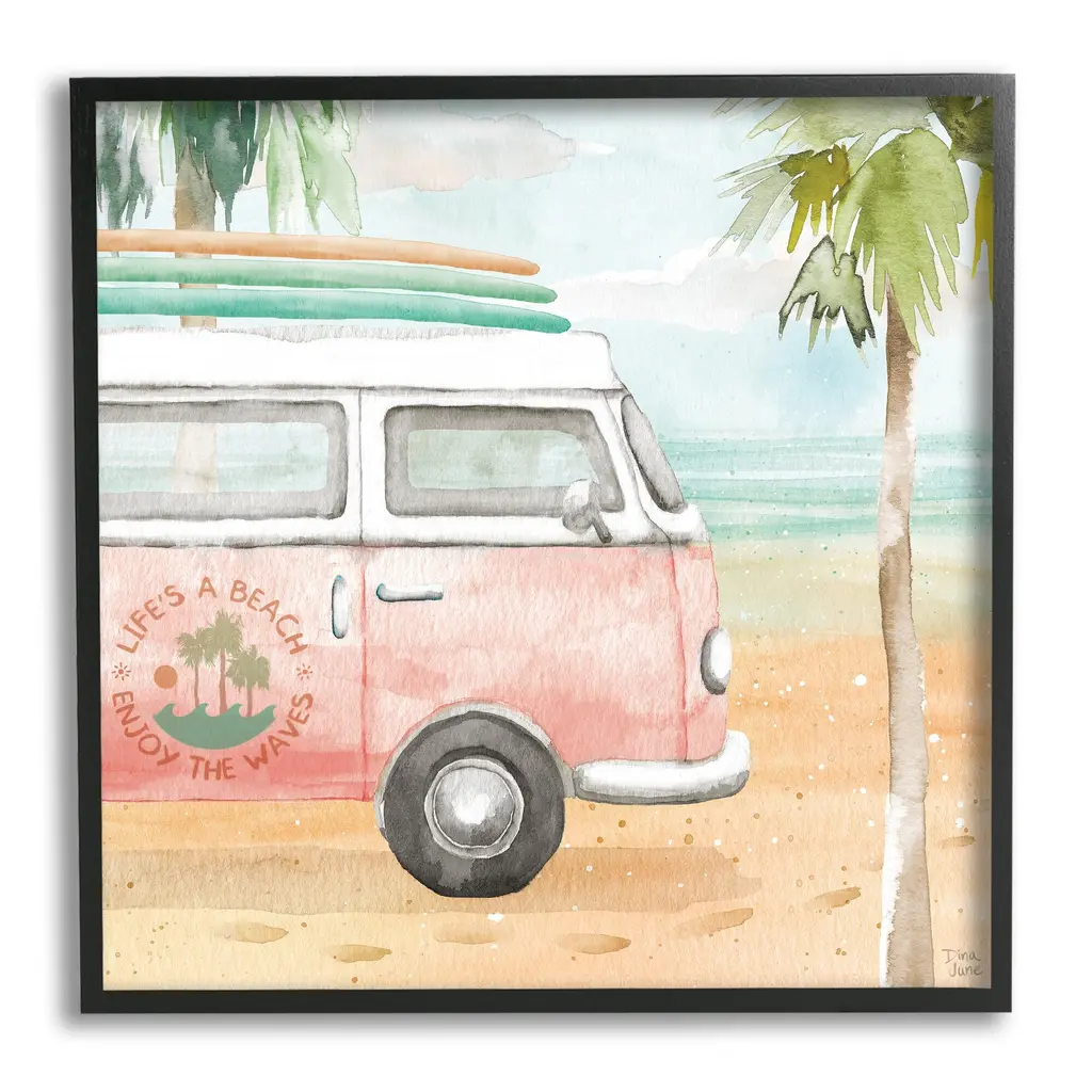 Our Framed Giclee Wall Art adds a touch of class to any space in your home or office. Frames are available in three alluring styles: black, gray farmhouse and white. Our textured artwork will add more depth and dimension to any space. Each piece is mounted with a 1.5 inch thick wood grain frame that is ready to hang! Looking for a statement piece? We have oversized artwork available.Features:Framed Giclee Sizes IncludeStandard: 12 x 1.5 x 12Large: 17 x 1.5 x 17Oversized: 24 x 1.5 x 24Wall Art is Ready to Hang - No Installation or Hardware Needed. For Easy Set Up Lean or Layer Artwork on Shelf or Against Wall.Artwork Relates To: Van, Transportation, Vehicle, Automobile, Palm Tree, Beach, Ocean, Water, VacationOur giclee prints are carefully mounted on a durable MDF backing, and then perfectly finished in a 1.5 inch thick woodgrain frame. Mounted frame colors include black, gray farmhouse and white. Made In USA.Design by Dina June