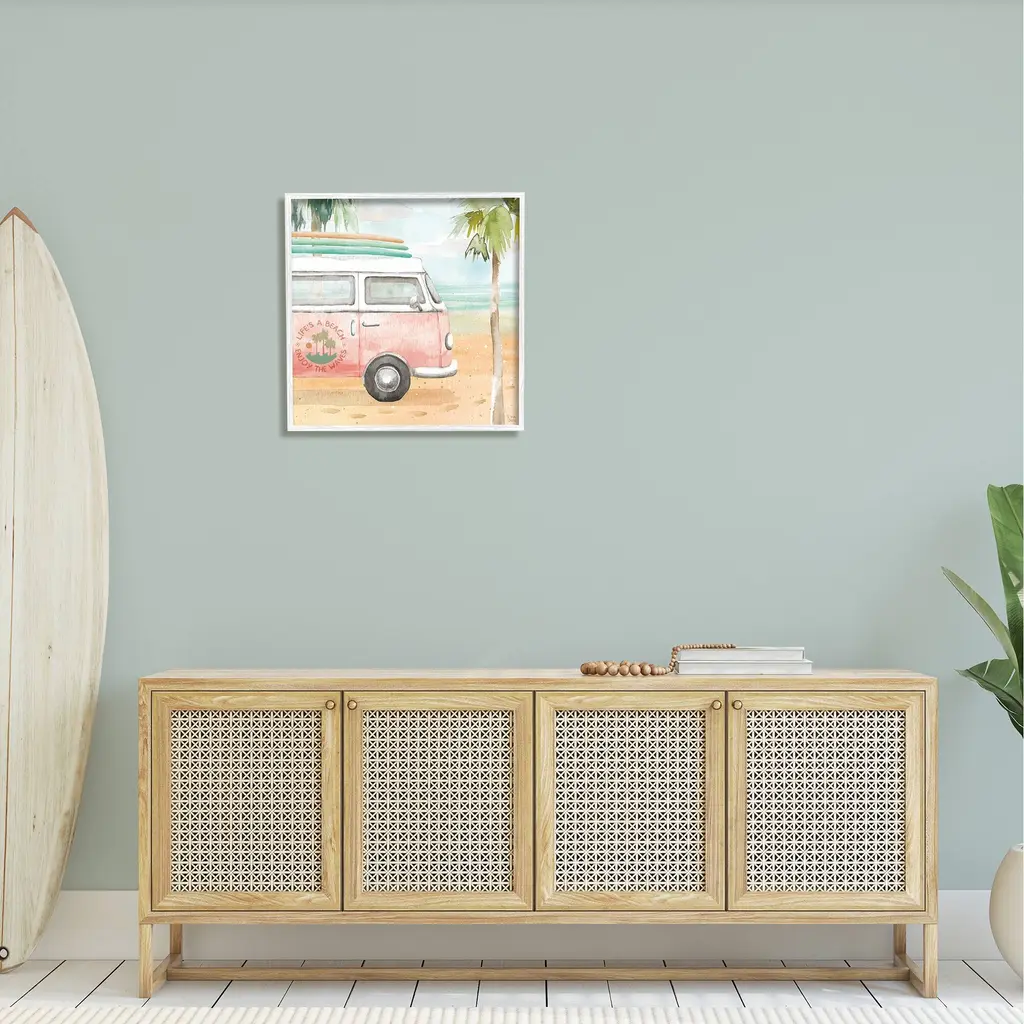 Our Framed Giclee Wall Art adds a touch of class to any space in your home or office. Frames are available in three alluring styles: black, gray farmhouse and white. Our textured artwork will add more depth and dimension to any space. Each piece is mounted with a 1.5 inch thick wood grain frame that is ready to hang! Looking for a statement piece? We have oversized artwork available.Features:Framed Giclee Sizes IncludeStandard: 12 x 1.5 x 12Large: 17 x 1.5 x 17Oversized: 24 x 1.5 x 24Wall Art is Ready to Hang - No Installation or Hardware Needed. For Easy Set Up Lean or Layer Artwork on Shelf or Against Wall.Artwork Relates To: Van, Transportation, Vehicle, Automobile, Palm Tree, Beach, Ocean, Water, VacationOur giclee prints are carefully mounted on a durable MDF backing, and then perfectly finished in a 1.5 inch thick woodgrain frame. Mounted frame colors include black, gray farmhouse and white. Made In USA.Design by Dina June