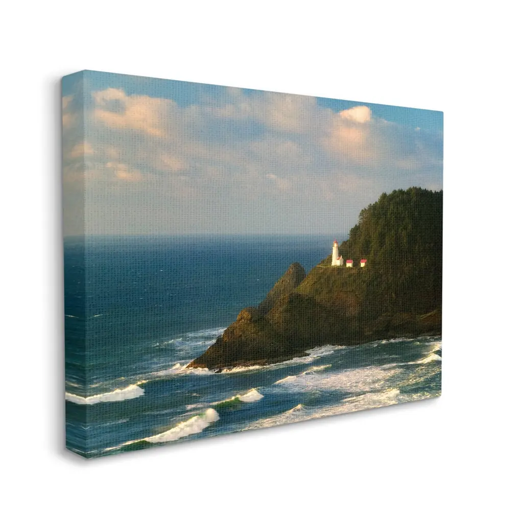 We create our stretched canvas to the highest standards. Using only the highest quality inks and canvas on Mimaki printers, we hand-cut and stretch each piece over a 1.5-inch thick wooden frame for hanging. As a result, the art comes ready to hang on the sturdy ledge with no installation required. Stupell Wall Art is made in the USA.Features: Dimensions: 20 x 1.5 x 16 InchesStretched Canvas Sizes Include Standard: 20 x 1.5 x 16 Large: 30 x 1.5 x 20 X-Large: 40 x 1.5 x 30 Oversized: 48 x 1.5 x 36Wall Art is Ready to Hang with Hardware Free Hanging. No installation required. For Easy Set Up Lean or Layer Artwork on Shelf or Against Wall.Our stretched canvas is created with the highest standards. We use only the highest quality inks and canvas on our in house Mimaki printers, and then hand cut and stretch each piece over a 1.5 inch thick wooden frame for hanging. Made In USA.Artwork Relates To: Nature, Outdoors, Sea, Water, Beacon, Building, Lighthouse, Scenery, CliffDesign by Dennis Frates
