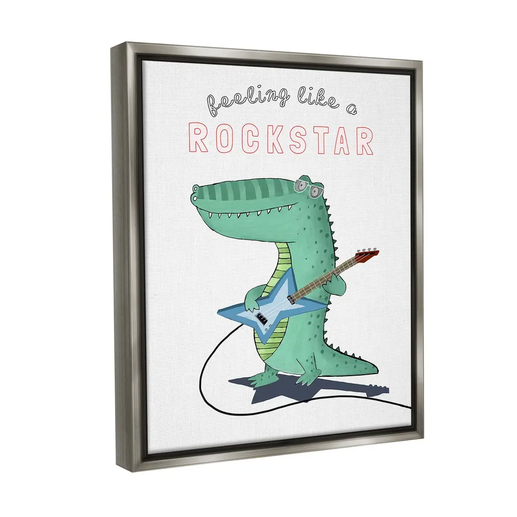 Elevate your home or office to the next level with Stupell Framed Floating Canvas Wall Art. Our premium hand-stretched canvas is mounted securely into a sturdy lightweight frame. The museum-style gap between the wrapped canvas and the box frame gives the illusion of floating artwork. Stupell Wall Art is made in the USA.Features: Dimensions: 17 x 1.7 x 21 Frame, 16 x 1.5 x 20 Canvas ArtFloating Frame Canvas Products are available in sizes 17"x21" and 25"x31". All Floating Frame Canvas Products have a 1.7" Depth.Wall Art is Ready to Hang with Hardware Free Hanging. No Installation required. For Easy Set Up Lean or Layer Artwork on Shelf or Against Wall. Artwork is Permently Fixed into the Frame.Our elevated 1.7" Thick Floating Frame is the perfect complement to our canvas style Wall Art. We use only the highest quality inks in house with industry leading printing solutions. Canvas is hand stretched over a durable wood foundation and then mounted securly into a Modern Box Frame. Made in the USA.Artwork Relates To: Animal, Alligator, Crocodile, Music, Musician, Guitar, Feeling Like a RockstarDesign by Carla Daly