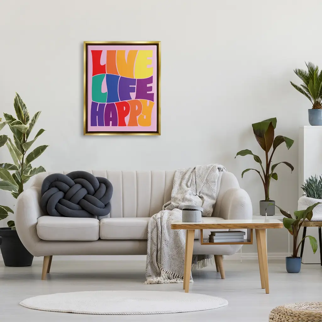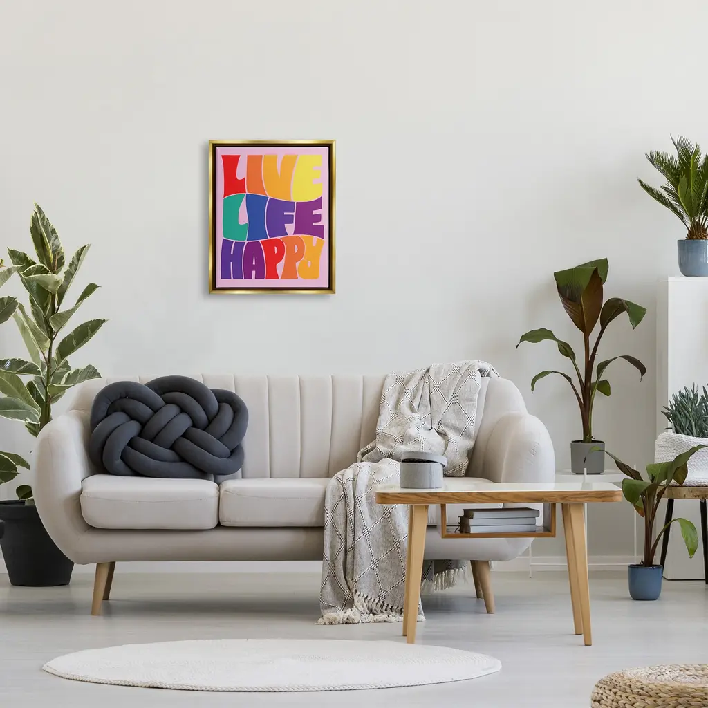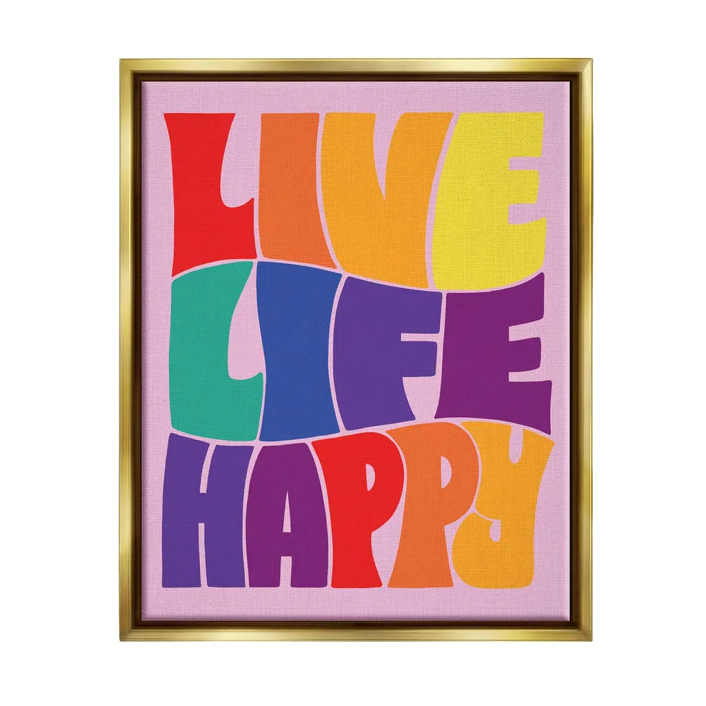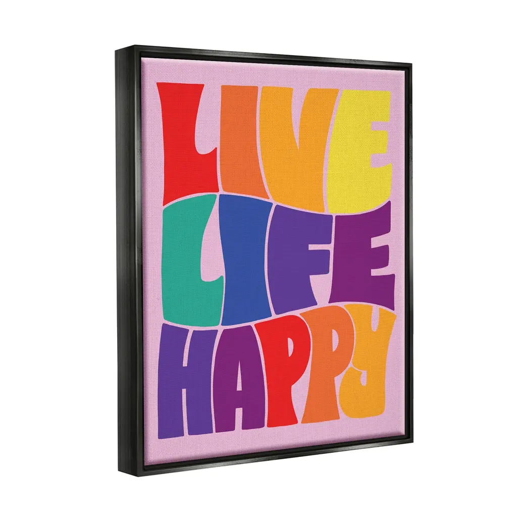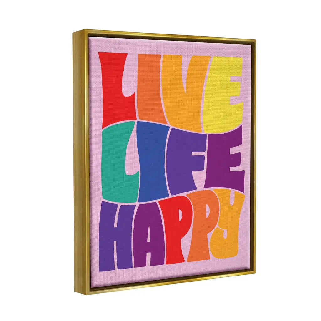 Elevate your home or office to the next level with Stupell Framed Floating Canvas Wall Art. Our premium hand-stretched canvas is mounted securely into a sturdy lightweight frame. The museum-style gap between the wrapped canvas and the box frame gives the illusion of floating artwork. Stupell Wall Art is made in the USA.Features: Dimensions: 17 x 1.7 x 21 Frame, 16 x 1.5 x 20 Canvas ArtFloating Frame Sizes Include Standard: 17 x 1.7 x 21 Oversized: 25 x 1.7 x 31Wall Art is Ready to Hang - No Installation or Hardware Needed. For Easy Set Up Lean or Layer Artwork on Shelf or Against Wall.Our elevated 1.7" Thick Floating Frame is the perfect complement to our canvas style Wall Art. We use only the highest quality inks in house with industry leading printing solutions. Canvas is hand stretched over a durable wood foundation and then mounted securly into a Modern Box Frame. Made in the USA.Artwork Relates To: Live Life Happy, Rainbow, Bold, PrideDesign by Jo Taylor