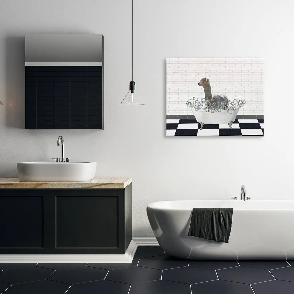 We create our stretched canvas to the highest standards. Using only the highest quality inks and canvas on Mimaki printers, we hand-cut and stretch each piece over a 1.5-inch thick wooden frame for hanging. As a result, the art comes ready to hang on the sturdy ledge with no installation required. Stupell Wall Art is made in the USA.Features: Dimensions: 20 x 1.5 x 16 InchesStretched Canvas Sizes Include Standard: 20 x 1.5 x 16 Large: 30 x 1.5 x 20 X-Large: 40 x 1.5 x 30 Oversized: 48 x 1.5 x 36Wall Art is Ready to Hang with Hardware Free Hanging. No installation required. For Easy Set Up Lean or Layer Artwork on Shelf or Against Wall.Our stretched canvas is created with the highest standards. We use only the highest quality inks and canvas on our in house Mimaki printers, and then hand cut and stretch each piece over a 1.5 inch thick wooden frame for hanging. Made In USA.Artwork Relates To: Bathing, Bathtub, Tub, Pattern, Bathroom, Bubbles, LlamaDesign by Amelia Noyes