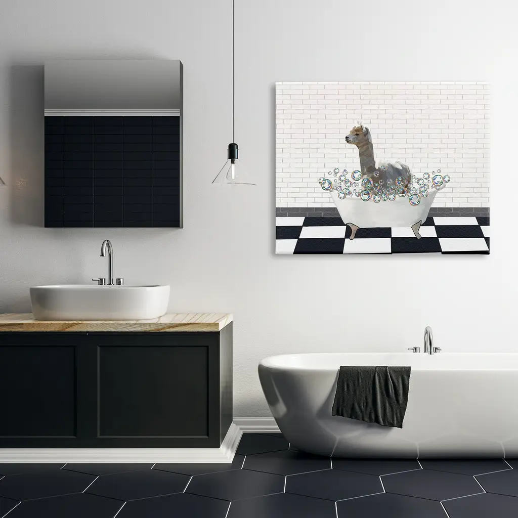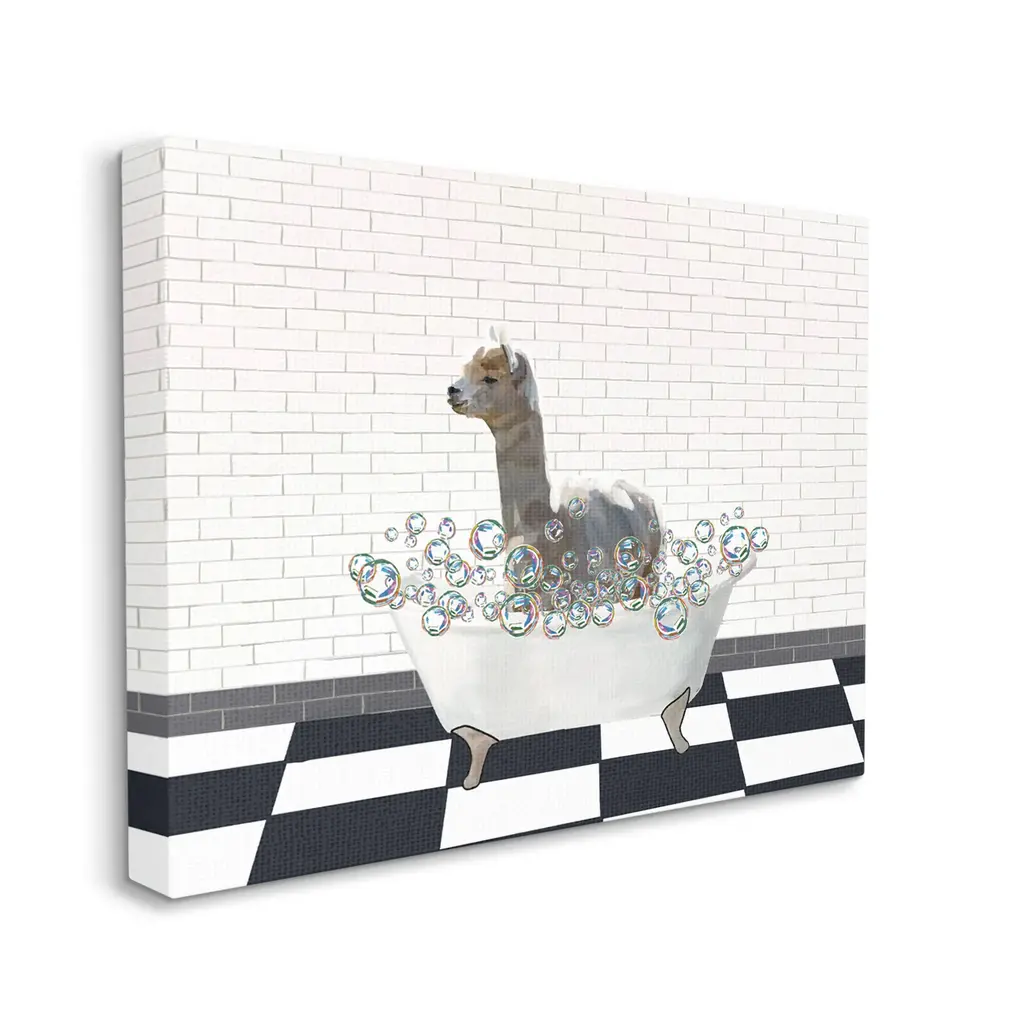We create our stretched canvas to the highest standards. Using only the highest quality inks and canvas on Mimaki printers, we hand-cut and stretch each piece over a 1.5-inch thick wooden frame for hanging. As a result, the art comes ready to hang on the sturdy ledge with no installation required. Stupell Wall Art is made in the USA.Features: Dimensions: 20 x 1.5 x 16 InchesStretched Canvas Sizes Include Standard: 20 x 1.5 x 16 Large: 30 x 1.5 x 20 X-Large: 40 x 1.5 x 30 Oversized: 48 x 1.5 x 36Wall Art is Ready to Hang with Hardware Free Hanging. No installation required. For Easy Set Up Lean or Layer Artwork on Shelf or Against Wall.Our stretched canvas is created with the highest standards. We use only the highest quality inks and canvas on our in house Mimaki printers, and then hand cut and stretch each piece over a 1.5 inch thick wooden frame for hanging. Made In USA.Artwork Relates To: Bathing, Bathtub, Tub, Pattern, Bathroom, Bubbles, LlamaDesign by Amelia Noyes