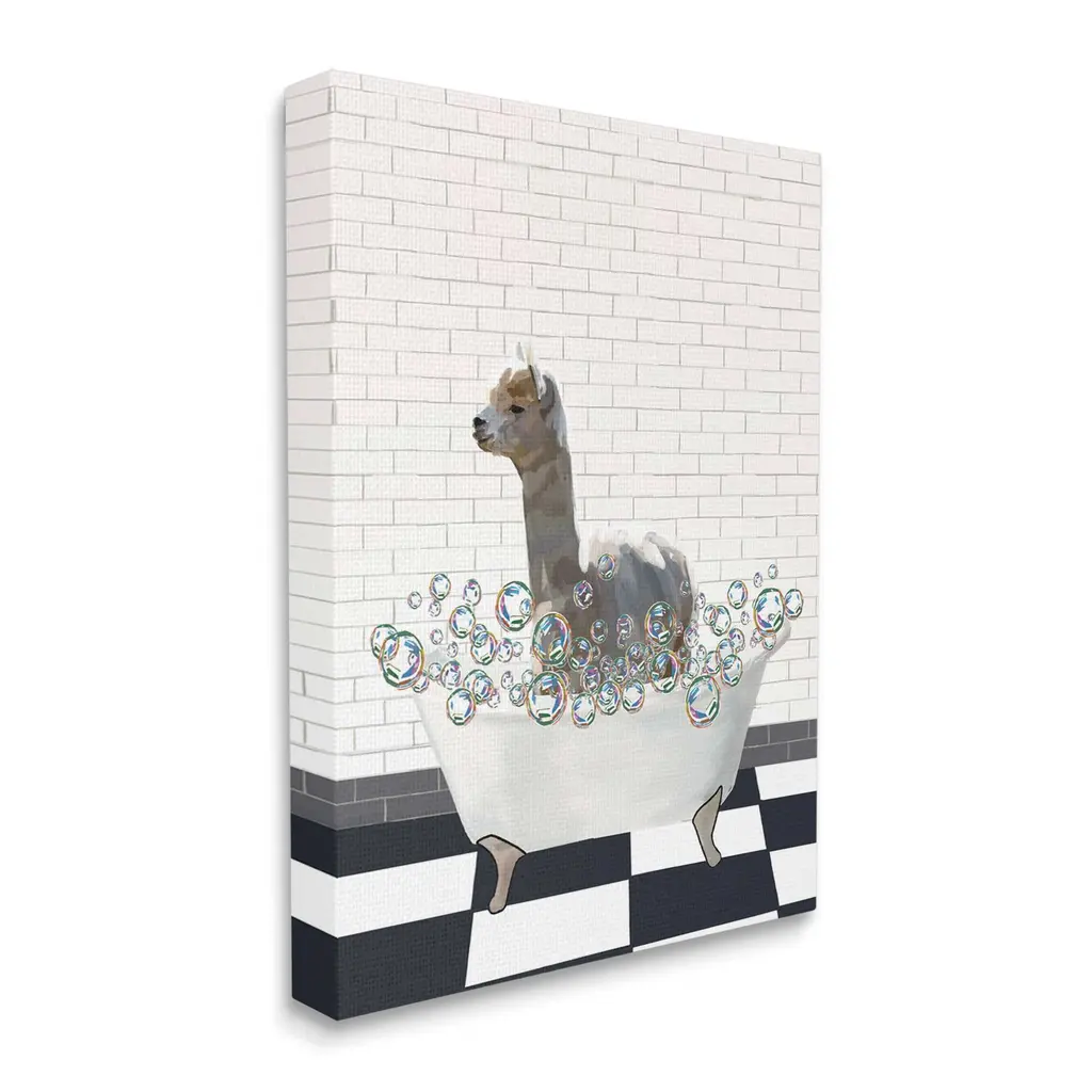 We create our stretched canvas to the highest standards. Using only the highest quality inks and canvas on Mimaki printers, we hand-cut and stretch each piece over a 1.5-inch thick wooden frame for hanging. As a result, the art comes ready to hang on the sturdy ledge with no installation required. Stupell Wall Art is made in the USA.Features: Dimensions: 16 x 1.5 x 20 InchesStretched Canvas Sizes Include Standard: 16 x 1.5 x 20 Large: 20 x 1.5 x 30 X-Large: 30 x 1.5 x 40 Oversized: 36 x 1.5 x 48Wall Art is Ready to Hang with Hardware Free Hanging. No installation required. For Easy Set Up Lean or Layer Artwork on Shelf or Against Wall.Our stretched canvas is created with the highest standards. We use only the highest quality inks and canvas on our in house Mimaki printers, and then hand cut and stretch each piece over a 1.5 inch thick wooden frame for hanging. Made In USA.Artwork Relates To: Bathing, Bathtub, Tub, Pattern, Bathroom, Bubbles, LlamaDesign by Amelia Noyes