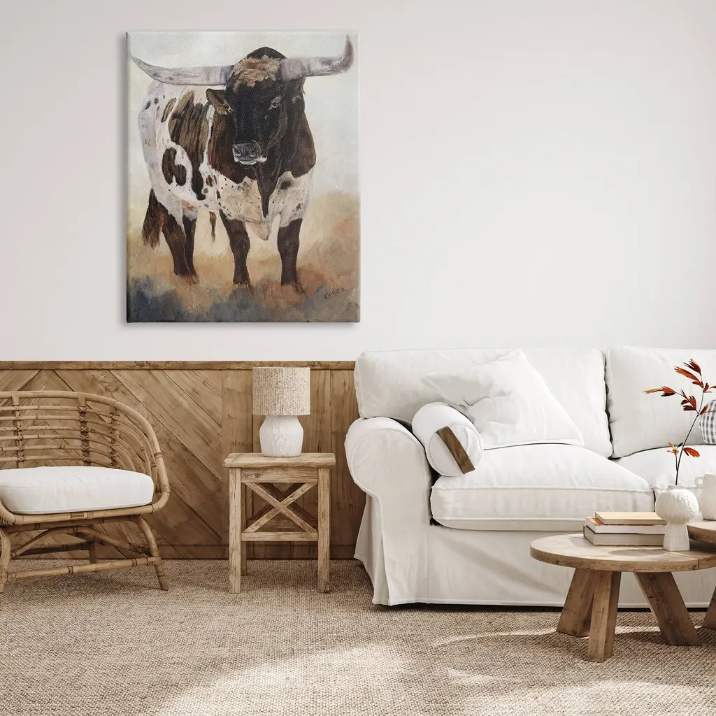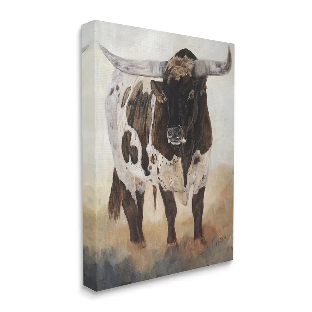 We create our stretched canvas to the highest standards. Using only the highest quality inks and canvas on Mimaki printers, we hand-cut and stretch each piece over a 1.5-inch thick wooden frame for hanging. As a result, the art comes ready to hang on the sturdy ledge with no installation required. Stupell Wall Art is made in the USA.Features: Dimensions: 16 x 1.5 x 20 InchesStretched Canvas Sizes Include Standard: 16 x 1.5 x 20 Large: 20 x 1.5 x 30 X-Large: 30 x 1.5 x 40 Oversized: 36 x 1.5 x 48Wall Art is Ready to Hang with Hardware Free Hanging. No installation required. For Easy Set Up Lean or Layer Artwork on Shelf or Against Wall.Our stretched canvas is created with the highest standards. We use only the highest quality inks and canvas on our in house Mimaki printers, and then hand cut and stretch each piece over a 1.5 inch thick wooden frame for hanging. Made In USA.Artwork Relates To: Animal, Bull, Mammal, Cattle, Longhorn, Cow, PaintingDesign by Kathy Winkler
