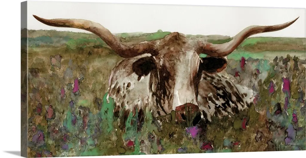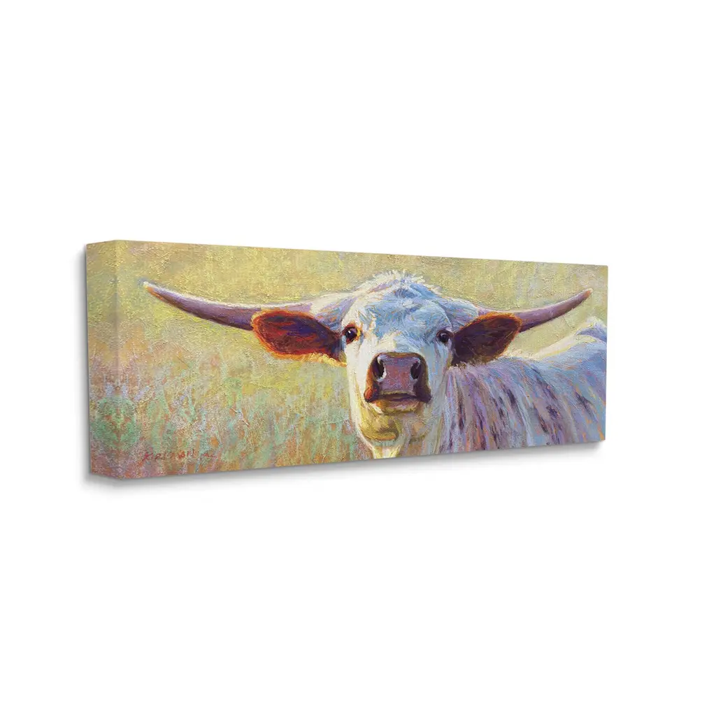 Proudly made in the USA, Our stretched canvas is created with the highest standards. We use only the highest quality inks and canvas on our in house Mimaki printers, and then hand cut and stretch each piece over a 1.5 inch thick wooden frame for hanging. The art comes ready to hang with no installation required.Features: Dimensions: 24 x 1.5 x 10 InchesStretched Canvas Sizes Include Standard: 24 x 1.5 x 10 Large: 30 x 1.5 x 13 X-Large: 40 x 1.5 x 17 Oversized: 48 x 1.5 x 20Wall Art is Ready to Hang - No Installation or Hardware Needed. For Easy Set Up Lean or Layer Artwork on Shelf or Against Wall.Our stretched canvas is created with the highest standards. We use only the highest quality inks and canvas on our in house Mimaki printers, and then hand cut and stretch each piece over a 1.5 inch thick wooden frame for hanging. Made In USA.Artwork Relates To: Cattle, Mammal, Animal, Painting, Farm Animal, CowDesign by Rita Kirkman