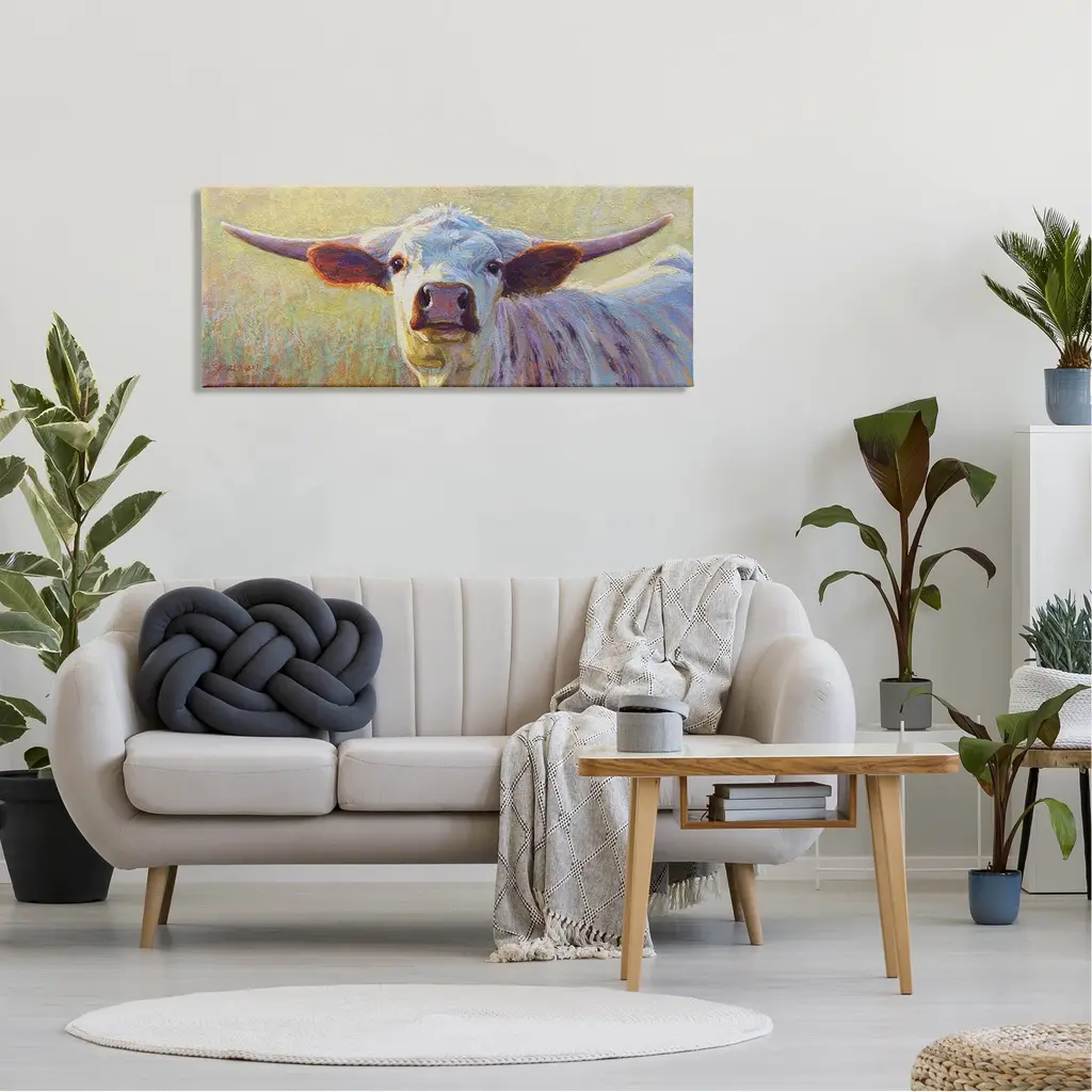 Proudly made in the USA, Our stretched canvas is created with the highest standards. We use only the highest quality inks and canvas on our in house Mimaki printers, and then hand cut and stretch each piece over a 1.5 inch thick wooden frame for hanging. The art comes ready to hang with no installation required.Features: Dimensions: 24 x 1.5 x 10 InchesStretched Canvas Sizes Include Standard: 24 x 1.5 x 10 Large: 30 x 1.5 x 13 X-Large: 40 x 1.5 x 17 Oversized: 48 x 1.5 x 20Wall Art is Ready to Hang - No Installation or Hardware Needed. For Easy Set Up Lean or Layer Artwork on Shelf or Against Wall.Our stretched canvas is created with the highest standards. We use only the highest quality inks and canvas on our in house Mimaki printers, and then hand cut and stretch each piece over a 1.5 inch thick wooden frame for hanging. Made In USA.Artwork Relates To: Cattle, Mammal, Animal, Painting, Farm Animal, CowDesign by Rita Kirkman