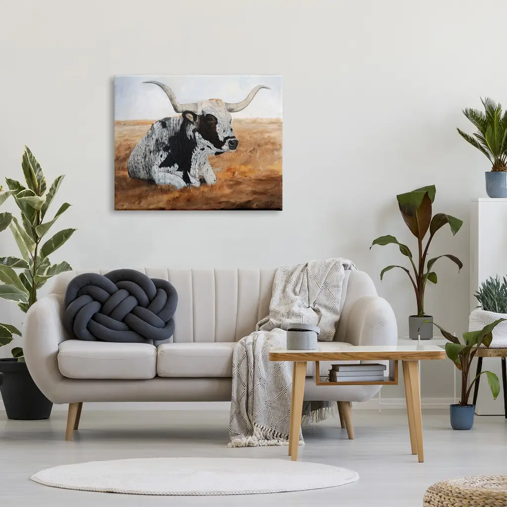 Proudly made in the USA, Our stretched canvas is created with the highest standards. We use only the highest quality inks and canvas on our in house Mimaki printers, and then hand cut and stretch each piece over a 1.5 inch thick wooden frame for hanging. The art comes ready to hang with no installation required. Room Type: Living Room, Den, Hallway, Office, Entryway, Study, Dining Room or Bedroom, Guest Room, Studio, Dorm or BoudoirFeatures: Dimensions: 20 x 1.5 x 16 InchesStretched Canvas Sizes Include Standard: 20 x 1.5 x 16 Large: 30 x 1.5 x 20 X-Large: 40 x 1.5 x 30 Oversized: 48 x 1.5 x 36Wall Art is Ready to Hang - No Installation or Hardware Needed. For Easy Set Up Lean or Layer Artwork on Shelf or Against Wall.Our stretched canvas is created with the highest standards. We use only the highest quality inks and canvas on our in house Mimaki printers, and then hand cut and stretch each piece over a 1.5 inch thick wooden frame for hanging. Made In USA.Artwork Relates To: Animal, Cattle, Longhorn, Mammal, CowDesign by Kathy Winkler
