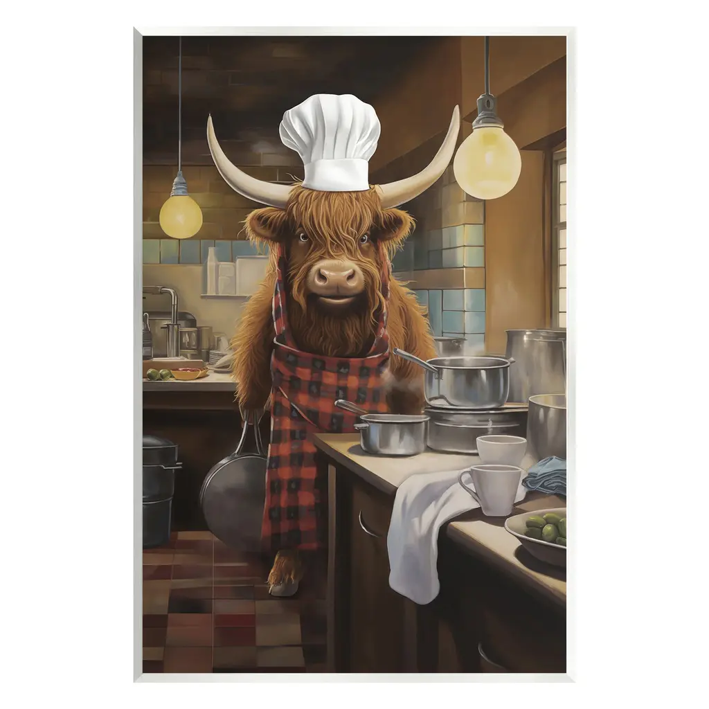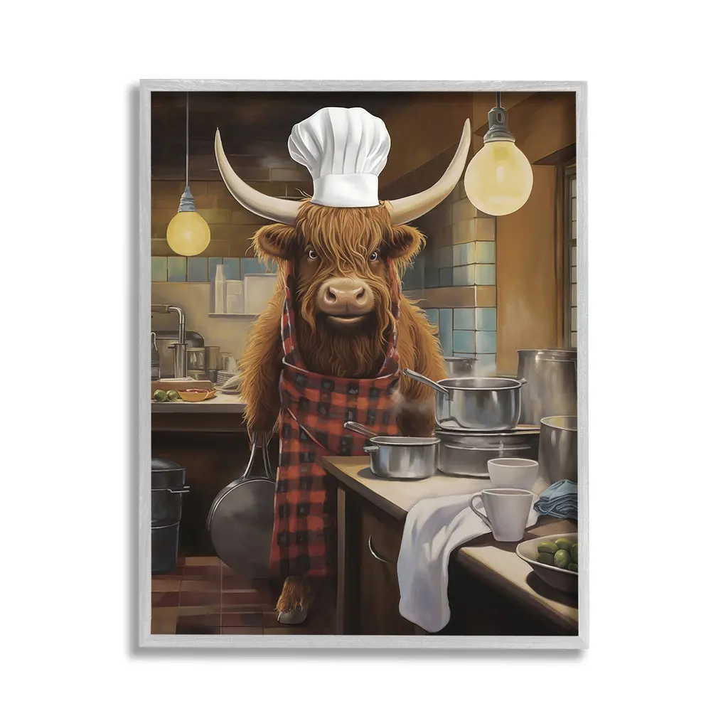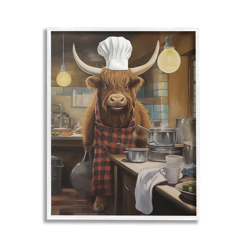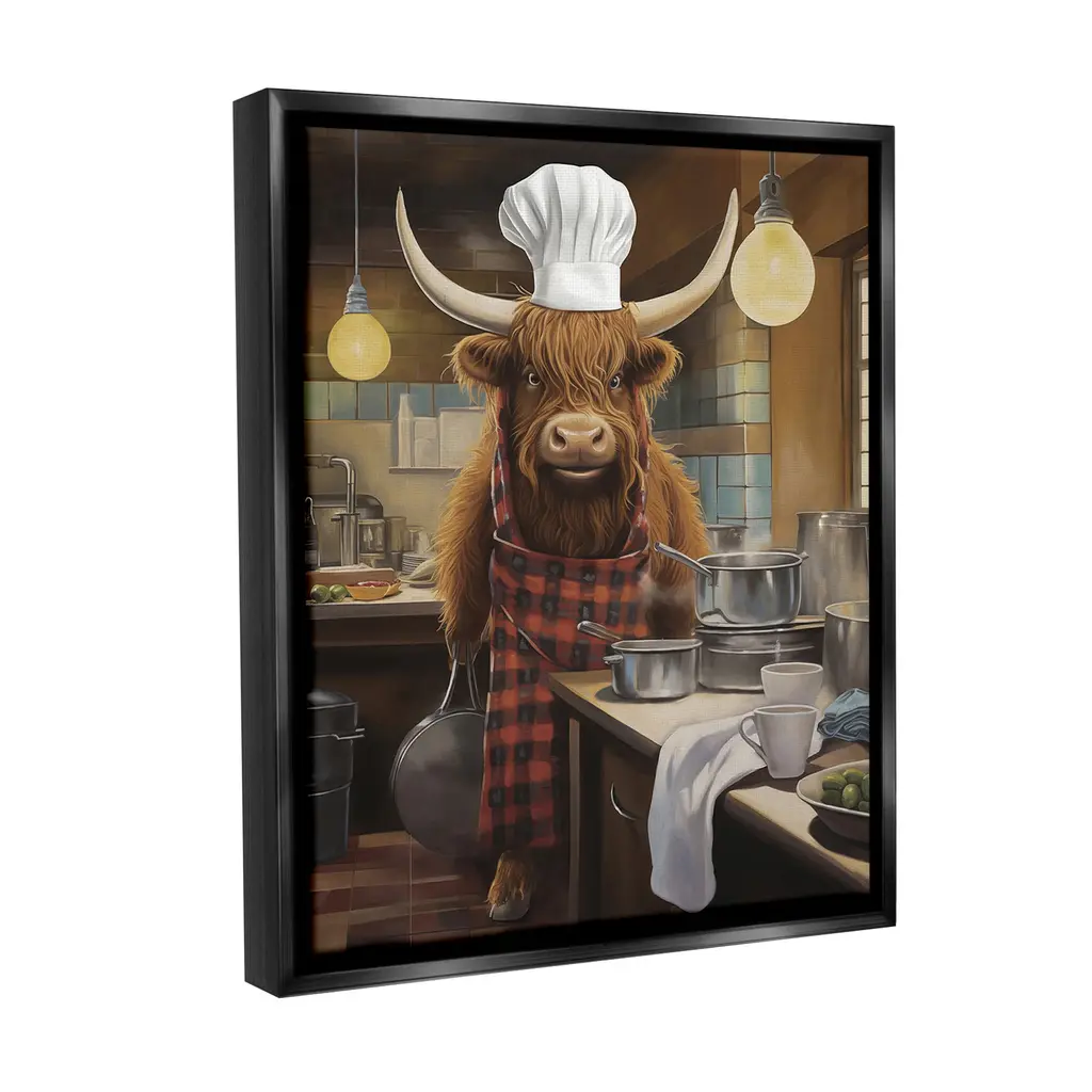 Elevate your home or office to the next level with Stupell Framed Floating Canvas Wall Art. Our premium hand-stretched canvas is mounted securely into a sturdy lightweight frame. The museum-style gap between the wrapped canvas and the box frame gives the illusion of floating artwork. Stupell Wall Art is made in the USA.Features: Dimensions: 17 x 1.7 x 21 Frame, 16 x 1.5 x 20 Canvas ArtFloating Frame Canvas Products are available in sizes 17"x21" and 25"x31". All Floating Frame Canvas Products have a 1.7" Depth.Wall Art is Ready to Hang with Hardware Free Hanging. No Installation required. For Easy Set Up Lean or Layer Artwork on Shelf or Against Wall. Artwork is Permently Fixed into the Frame.Our elevated 1.7" Thick Floating Frame is the perfect complement to our canvas style Wall Art. We use only the highest quality inks in house with industry leading printing solutions. Canvas is hand stretched over a durable wood foundation and then mounted securly into a Modern Box Frame. Made in the USA.Artwork Relates To: Animal, Bull, Mammal, Cattle, Cow, Longhorn, Kitchen, Chef, CookingDesign by PSL Art