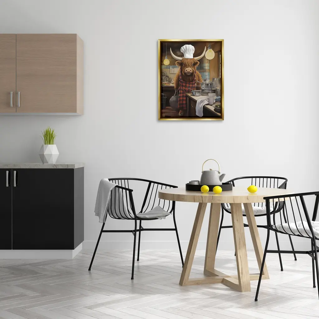 Elevate your home or office to the next level with Stupell Framed Floating Canvas Wall Art. Our premium hand-stretched canvas is mounted securely into a sturdy lightweight frame. The museum-style gap between the wrapped canvas and the box frame gives the illusion of floating artwork. Stupell Wall Art is made in the USA.Features: Dimensions: 17 x 1.7 x 21 Frame, 16 x 1.5 x 20 Canvas ArtFloating Frame Canvas Products are available in sizes 17"x21" and 25"x31". All Floating Frame Canvas Products have a 1.7" Depth.Wall Art is Ready to Hang with Hardware Free Hanging. No Installation required. For Easy Set Up Lean or Layer Artwork on Shelf or Against Wall. Artwork is Permently Fixed into the Frame.Our elevated 1.7" Thick Floating Frame is the perfect complement to our canvas style Wall Art. We use only the highest quality inks in house with industry leading printing solutions. Canvas is hand stretched over a durable wood foundation and then mounted securly into a Modern Box Frame. Made in the USA.Artwork Relates To: Animal, Bull, Mammal, Cattle, Cow, Longhorn, Kitchen, Chef, CookingDesign by PSL Art