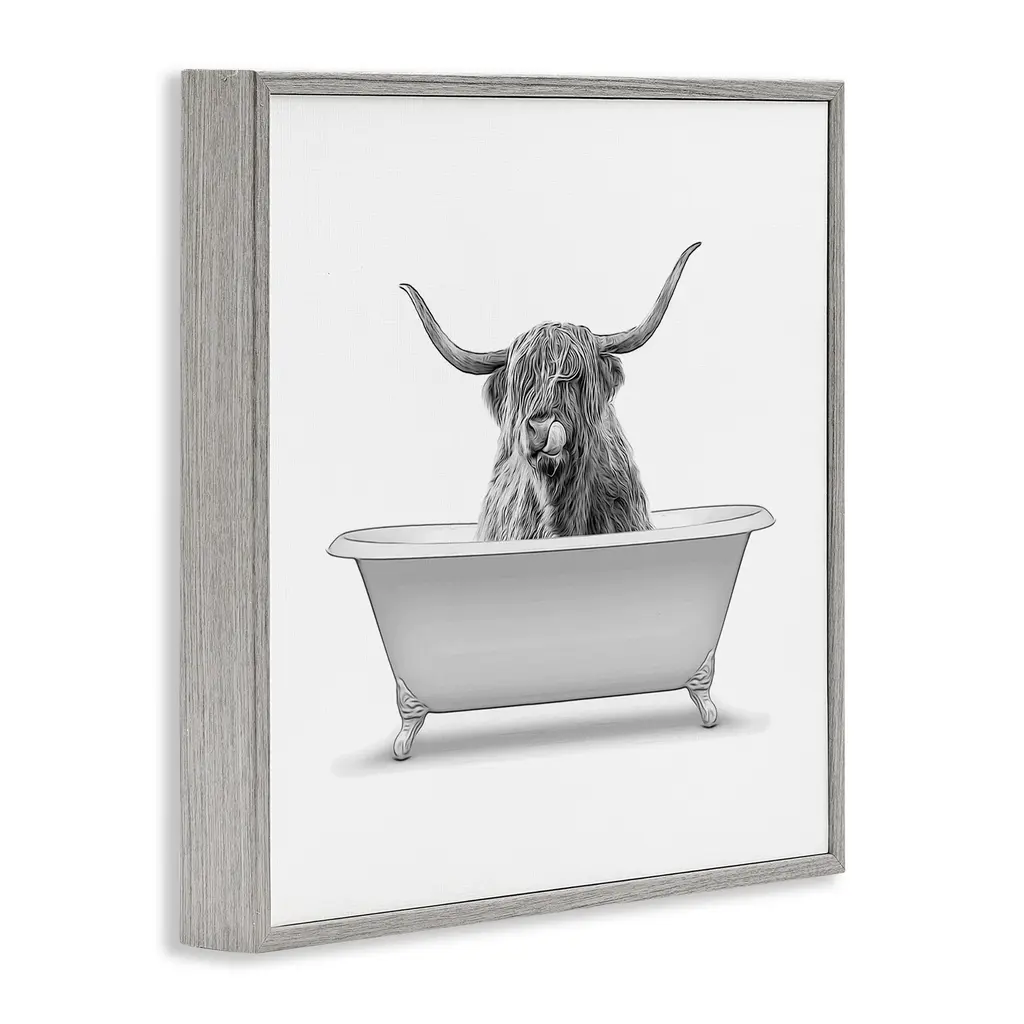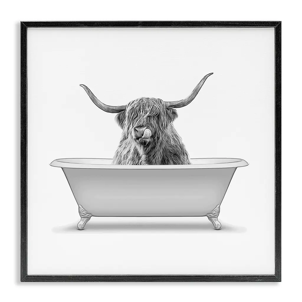 Our Framed Giclee Wall Art adds a touch of class to any space in your home or office. Frames are available in three alluring styles: black, gray farmhouse and white. Our textured artwork will add more depth and dimension to any space. Each piece is mounted with a 1.5 inch thick wood grain frame that is ready to hang! Looking for a statement piece? We have oversized artwork available.Features:Framed Giclee Sizes IncludeStandard: 12 x 1.5 x 12Large: 17 x 1.5 x 17Oversized: 24 x 1.5 x 24Wall Art is Ready to Hang - No Installation or Hardware Needed. For Easy Set Up Lean or Layer Artwork on Shelf or Against Wall.Artwork Relates To: Bathtub, Tub, Cow, Animal, Mammal, Cattle, Highland Cattle, Farm AnimalOur giclee prints are carefully mounted on a durable MDF backing, and then perfectly finished in a 1.5 inch thick woodgrain frame. Mounted frame colors include black, gray farmhouse and white. Made In USA.Design by Annalisa Latella