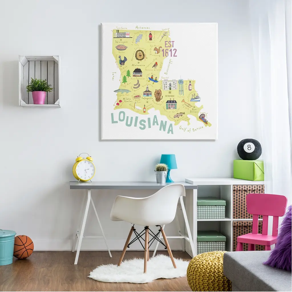 We create our stretched canvas to the highest standards. Using only the highest quality inks and canvas on Mimaki printers, we hand-cut and stretch each piece over a 1.5-inch thick wooden frame for hanging. As a result, the art comes ready to hang on the sturdy ledge with no installation required. Stupell Wall Art is made in the USA.Features: Dimensions: 17 x 1.5 x 17 InchesStretched Canvas Sizes Include Standard: 17 x 1.5 x 17 Large: 24 x 1.5 x 24 X-Large: 30 x 1.5 x 30 Oversized: 36 x 1.5 x 36Wall Art is Ready to Hang - No Installation or Hardware Needed. For Easy Set Up Lean or Layer Artwork on Shelf or Against Wall.Our stretched canvas is created with the highest standards. We use only the highest quality inks and canvas on our in house Mimaki printers, and then hand cut and stretch each piece over a 1.5 inch thick wooden frame for hanging. Made In USA.Artwork Relates To: USA, State, Landmarks, Map, Diagram, LouisianaDesign by Carla Daly