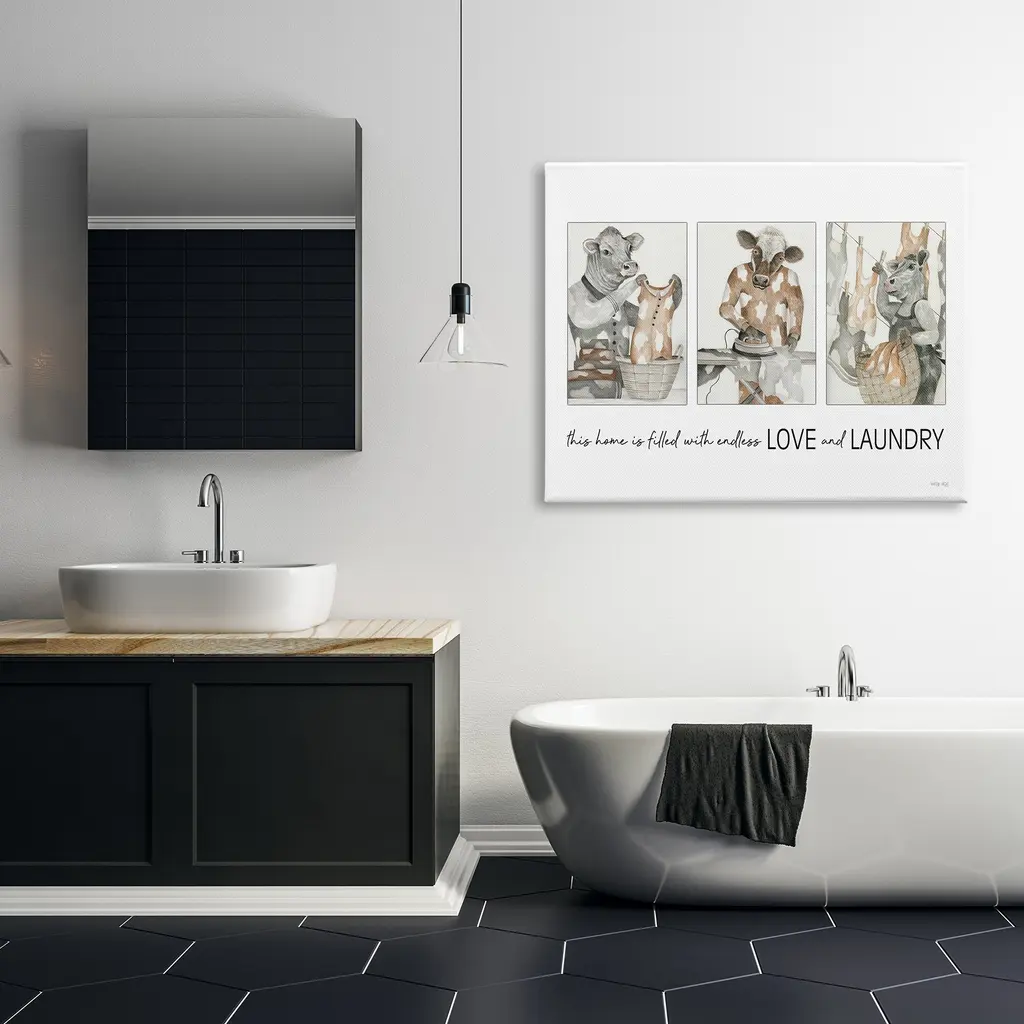 We create our stretched canvas to the highest standards. Using only the highest quality inks and canvas on Mimaki printers, we hand-cut and stretch each piece over a 1.5-inch thick wooden frame for hanging. As a result, the art comes ready to hang on the sturdy ledge with no installation required. Stupell Wall Art is made in the USA.Features: Dimensions: 20 x 1.5 x 16 InchesStretched Canvas Sizes Include Standard: 20 x 1.5 x 16 Large: 30 x 1.5 x 20 X-Large: 40 x 1.5 x 30 Oversized: 48 x 1.5 x 36Wall Art is Ready to Hang with Hardware Free Hanging. No installation required. For Easy Set Up Lean or Layer Artwork on Shelf or Against Wall.Our stretched canvas is created with the highest standards. We use only the highest quality inks and canvas on our in house Mimaki printers, and then hand cut and stretch each piece over a 1.5 inch thick wooden frame for hanging. Made In USA.Artwork Relates To: Clothing, Animal, Cow, Cattle, Laundry, This Home is Filled with Endless Love and LaundryDesign by Cindy Jacobs