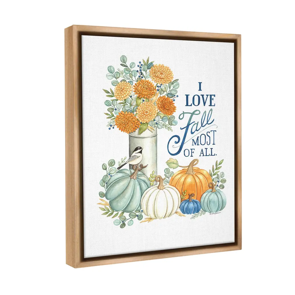 Elevate your home or office to the next level with Stupell Framed Floating Canvas Wall Art. Our premium hand-stretched canvas is mounted securely into a sturdy lightweight frame. The museum-style gap between the wrapped canvas and the box frame gives the illusion of floating artwork. Stupell Wall Art is made in the USA.Features: Dimensions: 17 x 1.7 x 21 Frame, 16 x 1.5 x 20 Canvas ArtFloating Frame Canvas Products are available in sizes 17"x21" and 25"x31". All Floating Frame Canvas Products have a 1.7" Depth.Wall Art is Ready to Hang with Hardware Free Hanging. No Installation required. For Easy Set Up Lean or Layer Artwork on Shelf or Against Wall. Artwork is Permently Fixed into the Frame.Our elevated 1.7" Thick Floating Frame is the perfect complement to our canvas style Wall Art. We use only the highest quality inks in house with industry leading printing solutions. Canvas is hand stretched over a durable wood foundation and then mounted securly into a Modern Box Frame. Made in the USA.Artwork Relates To: Nature, Country, Harvest, Plant, Fall, Autumn, Pumpkin, Phrase, Bird, I Love Fall Most of AllDesign by Deb Strain