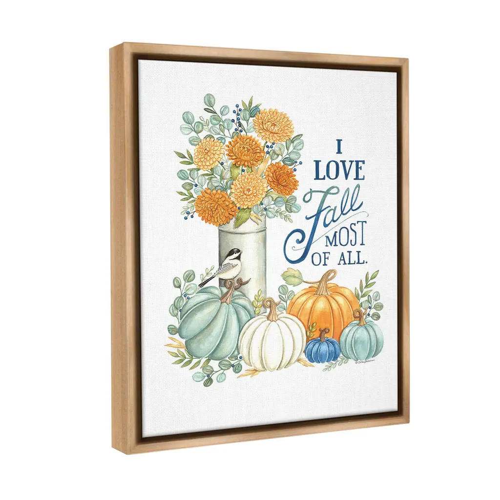 Elevate your home or office to the next level with Stupell Framed Floating Canvas Wall Art. Our premium hand-stretched canvas is mounted securely into a sturdy lightweight frame. The museum-style gap between the wrapped canvas and the box frame gives the illusion of floating artwork. Stupell Wall Art is made in the USA.Features: Dimensions: 17 x 1.7 x 21 Frame, 16 x 1.5 x 20 Canvas ArtFloating Frame Canvas Products are available in sizes 17"x21" and 25"x31". All Floating Frame Canvas Products have a 1.7" Depth.Wall Art is Ready to Hang with Hardware Free Hanging. No Installation required. For Easy Set Up Lean or Layer Artwork on Shelf or Against Wall. Artwork is Permently Fixed into the Frame.Our elevated 1.7" Thick Floating Frame is the perfect complement to our canvas style Wall Art. We use only the highest quality inks in house with industry leading printing solutions. Canvas is hand stretched over a durable wood foundation and then mounted securly into a Modern Box Frame. Made in the USA.Artwork Relates To: Nature, Country, Harvest, Plant, Fall, Autumn, Pumpkin, Phrase, Bird, I Love Fall Most of AllDesign by Deb Strain