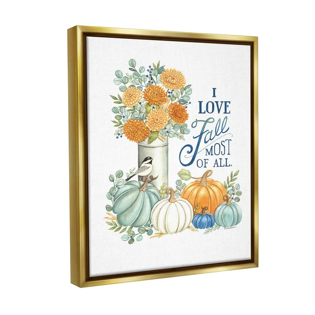 Elevate your home or office to the next level with Stupell Framed Floating Canvas Wall Art. Our premium hand-stretched canvas is mounted securely into a sturdy lightweight frame. The museum-style gap between the wrapped canvas and the box frame gives the illusion of floating artwork. Stupell Wall Art is made in the USA.Features: Dimensions: 17 x 1.7 x 21 Frame, 16 x 1.5 x 20 Canvas ArtFloating Frame Canvas Products are available in sizes 17"x21" and 25"x31". All Floating Frame Canvas Products have a 1.7" Depth.Wall Art is Ready to Hang with Hardware Free Hanging. No Installation required. For Easy Set Up Lean or Layer Artwork on Shelf or Against Wall. Artwork is Permently Fixed into the Frame.Our elevated 1.7" Thick Floating Frame is the perfect complement to our canvas style Wall Art. We use only the highest quality inks in house with industry leading printing solutions. Canvas is hand stretched over a durable wood foundation and then mounted securly into a Modern Box Frame. Made in the USA.Artwork Relates To: Nature, Country, Harvest, Plant, Fall, Autumn, Pumpkin, Phrase, Bird, I Love Fall Most of AllDesign by Deb Strain