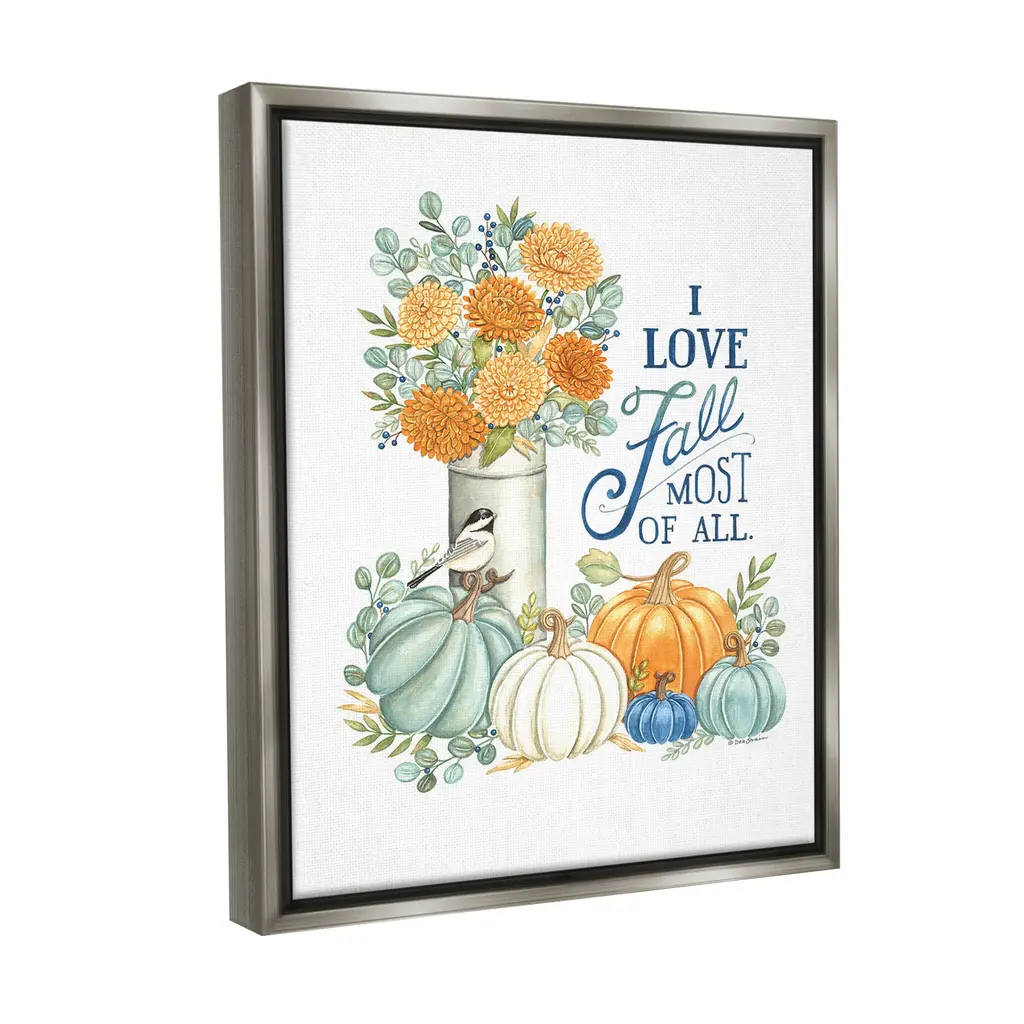 Elevate your home or office to the next level with Stupell Framed Floating Canvas Wall Art. Our premium hand-stretched canvas is mounted securely into a sturdy lightweight frame. The museum-style gap between the wrapped canvas and the box frame gives the illusion of floating artwork. Stupell Wall Art is made in the USA.Features: Dimensions: 17 x 1.7 x 21 Frame, 16 x 1.5 x 20 Canvas ArtFloating Frame Canvas Products are available in sizes 17"x21" and 25"x31". All Floating Frame Canvas Products have a 1.7" Depth.Wall Art is Ready to Hang with Hardware Free Hanging. No Installation required. For Easy Set Up Lean or Layer Artwork on Shelf or Against Wall. Artwork is Permently Fixed into the Frame.Our elevated 1.7" Thick Floating Frame is the perfect complement to our canvas style Wall Art. We use only the highest quality inks in house with industry leading printing solutions. Canvas is hand stretched over a durable wood foundation and then mounted securly into a Modern Box Frame. Made in the USA.Artwork Relates To: Nature, Country, Harvest, Plant, Fall, Autumn, Pumpkin, Phrase, Bird, I Love Fall Most of AllDesign by Deb Strain