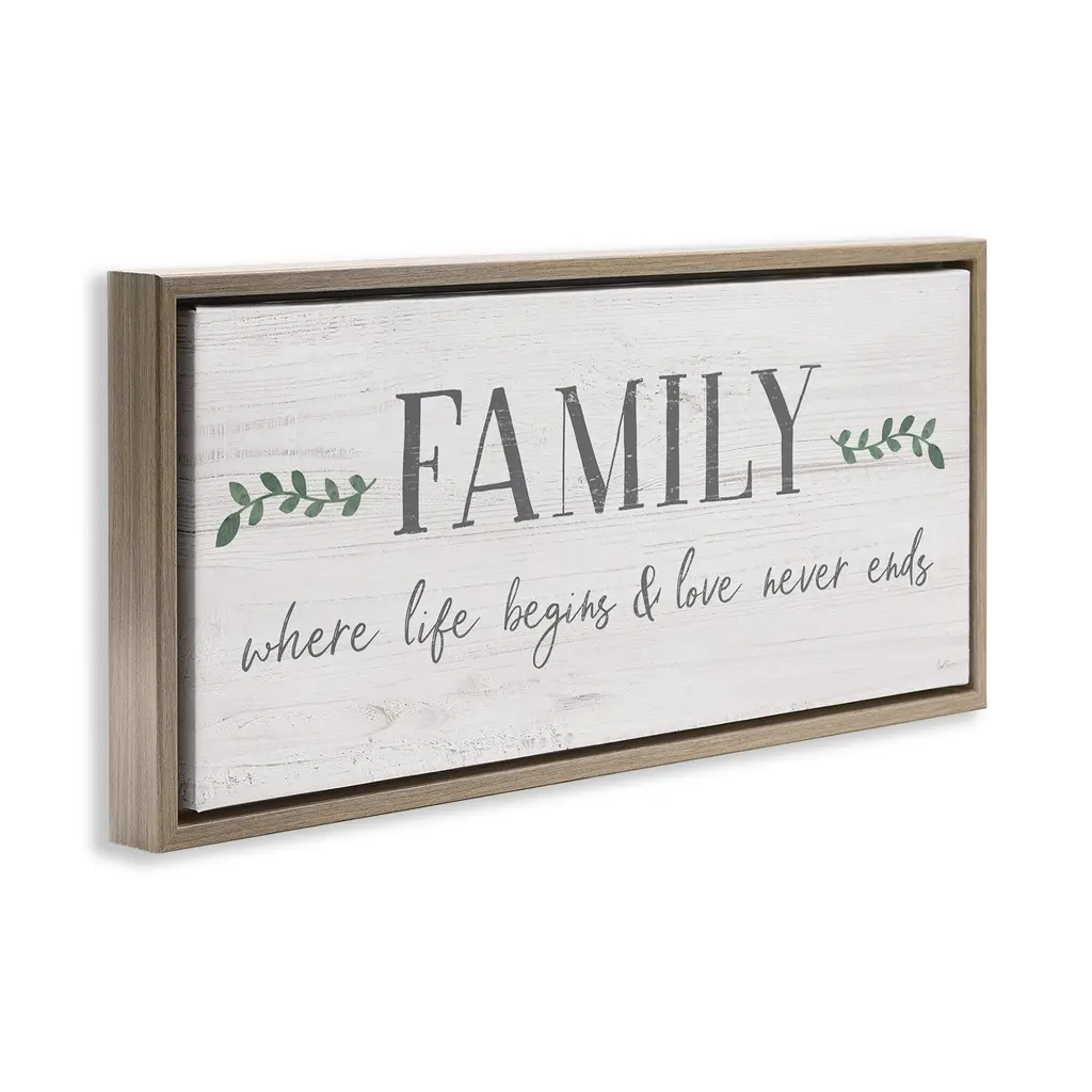 Elevate your home or office to the next level with Stupell Framed Floating Canvas Wall Art. Our premium hand-stretched canvas is mounted securely into a sturdy lightweight frame. The museum-style gap between the wrapped canvas and the box frame gives the illusion of floating artwork. Stupell Wall Art is made in the USA.Features: Dimensions: 25 x 1.7 x 11 Frame, 24 x 1.5 x 10 Canvas ArtFloating Frame Canvas Products are available in sizes 25"x11" and 31"x14". All Floating Frame Canvas Products have a 1.7" Depth.Wall Art is Ready to Hang with Hardware Free Hanging. No Installation required. For Easy Set Up Lean or Layer Artwork on Shelf or Against Wall. Artwork is Permently Fixed into the Frame.Our elevated 1.7" Thick Floating Frame is the perfect complement to our canvas style Wall Art. We use only the highest quality inks in house with industry leading printing solutions. Canvas is hand stretched over a durable wood foundation and then mounted securly into a Modern Box Frame. Made in the USA.Artwork Relates To: Phrase, Family, Botanical, Plant, Leaf, InspirationalDesign by Natalie Carpentieri