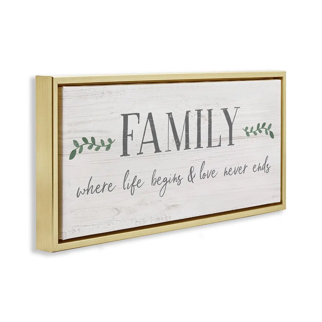 Elevate your home or office to the next level with Stupell Framed Floating Canvas Wall Art. Our premium hand-stretched canvas is mounted securely into a sturdy lightweight frame. The museum-style gap between the wrapped canvas and the box frame gives the illusion of floating artwork. Stupell Wall Art is made in the USA.Features: Dimensions: 25 x 1.7 x 11 Frame, 24 x 1.5 x 10 Canvas ArtFloating Frame Canvas Products are available in sizes 25"x11" and 31"x14". All Floating Frame Canvas Products have a 1.7" Depth.Wall Art is Ready to Hang with Hardware Free Hanging. No Installation required. For Easy Set Up Lean or Layer Artwork on Shelf or Against Wall. Artwork is Permently Fixed into the Frame.Our elevated 1.7" Thick Floating Frame is the perfect complement to our canvas style Wall Art. We use only the highest quality inks in house with industry leading printing solutions. Canvas is hand stretched over a durable wood foundation and then mounted securly into a Modern Box Frame. Made in the USA.Artwork Relates To: Phrase, Family, Botanical, Plant, Leaf, InspirationalDesign by Natalie Carpentieri