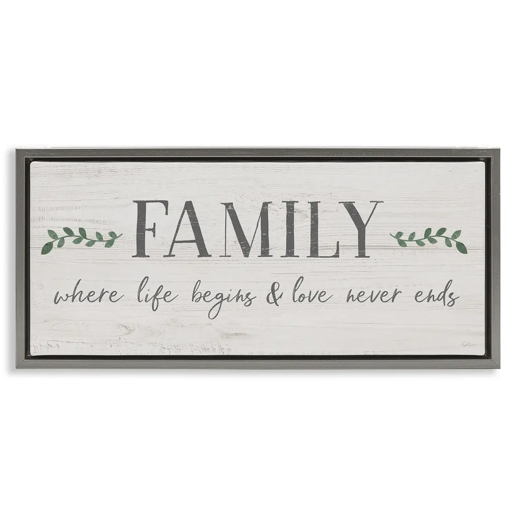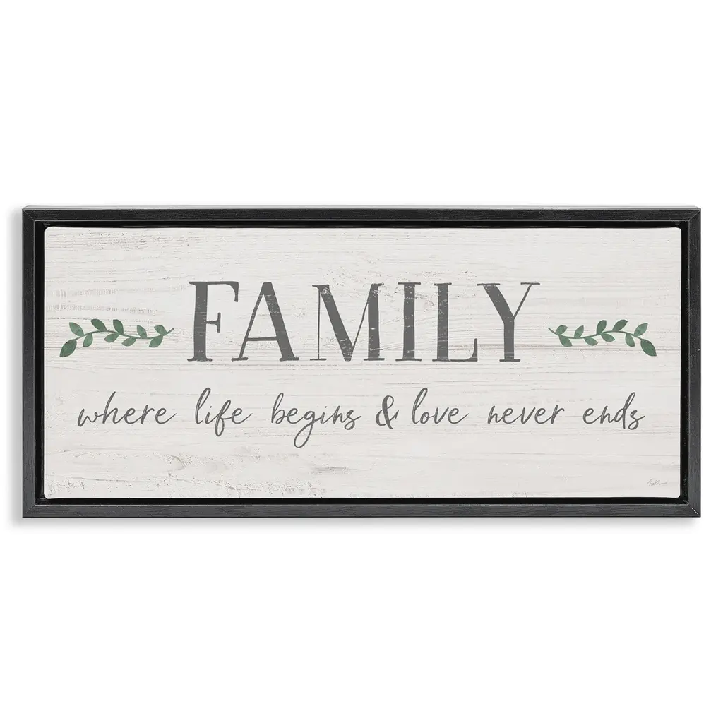 Elevate your home or office to the next level with Stupell Framed Floating Canvas Wall Art. Our premium hand-stretched canvas is mounted securely into a sturdy lightweight frame. The museum-style gap between the wrapped canvas and the box frame gives the illusion of floating artwork. Stupell Wall Art is made in the USA.Features: Dimensions: 25 x 1.7 x 11 Frame, 24 x 1.5 x 10 Canvas ArtFloating Frame Canvas Products are available in sizes 25"x11" and 31"x14". All Floating Frame Canvas Products have a 1.7" Depth.Wall Art is Ready to Hang with Hardware Free Hanging. No Installation required. For Easy Set Up Lean or Layer Artwork on Shelf or Against Wall. Artwork is Permently Fixed into the Frame.Our elevated 1.7" Thick Floating Frame is the perfect complement to our canvas style Wall Art. We use only the highest quality inks in house with industry leading printing solutions. Canvas is hand stretched over a durable wood foundation and then mounted securly into a Modern Box Frame. Made in the USA.Artwork Relates To: Phrase, Family, Botanical, Plant, Leaf, InspirationalDesign by Natalie Carpentieri