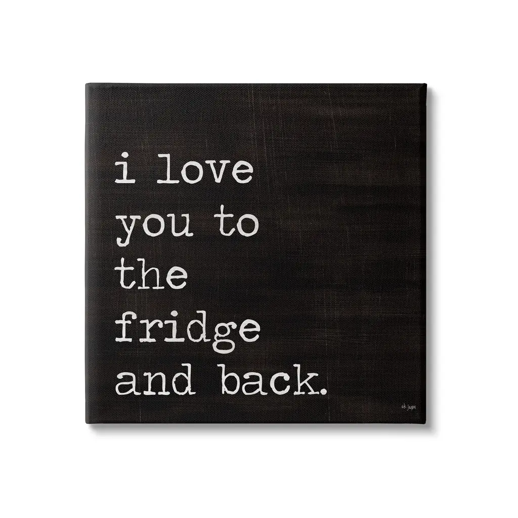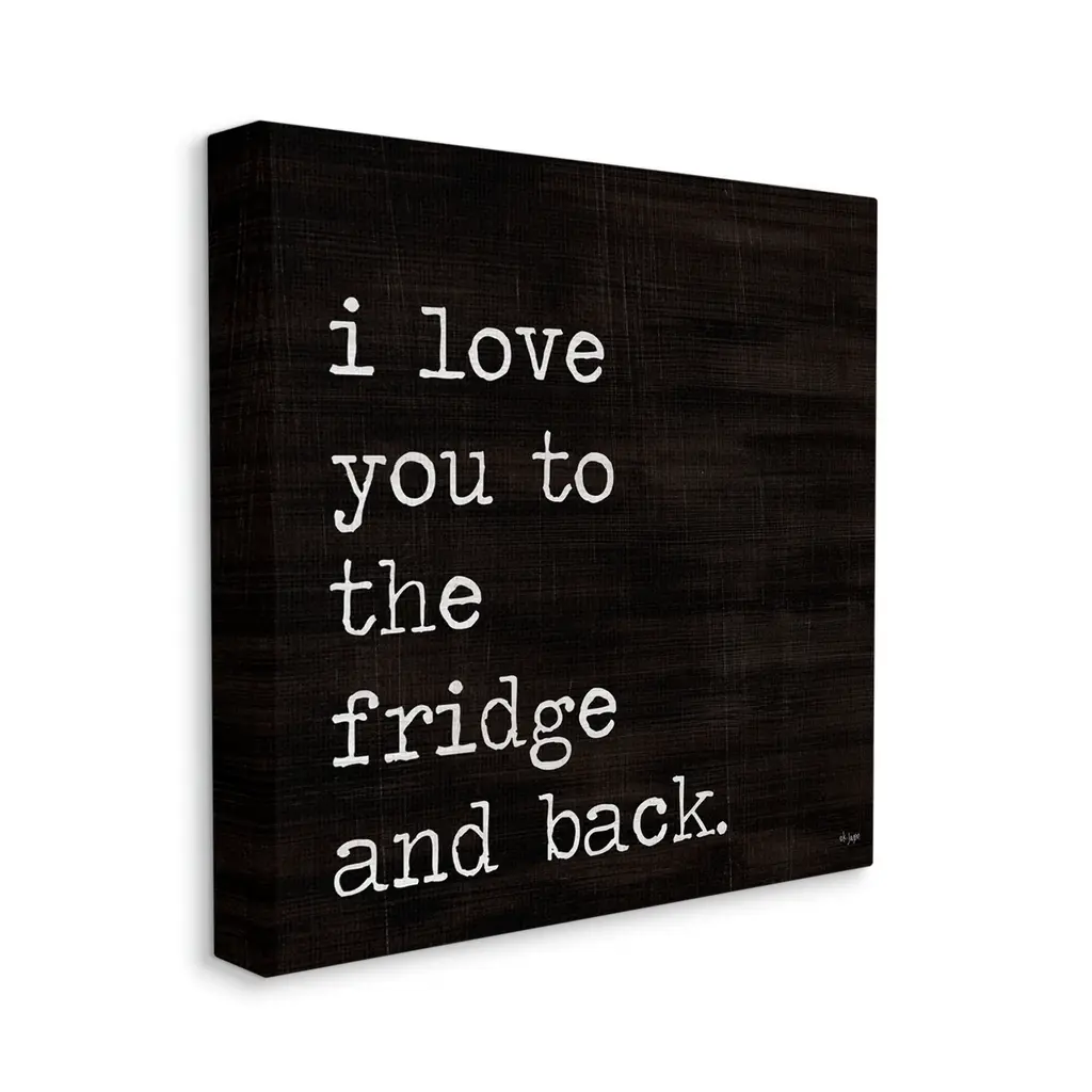 We create our stretched canvas to the highest standards. Using only the highest quality inks and canvas on Mimaki printers, we hand-cut and stretch each piece over a 1.5-inch thick wooden frame for hanging. As a result, the art comes ready to hang on the sturdy ledge with no installation required. Stupell Wall Art is made in the USA.Features: Dimensions: 17 x 1.5 x 17 InchesStretched Canvas Sizes Include Standard: 17 x 1.5 x 17 Large: 24 x 1.5 x 24 X-Large: 30 x 1.5 x 30 Oversized: 36 x 1.5 x 36Wall Art is Ready to Hang with Hardware Free Hanging. No installation required. For Easy Set Up Lean or Layer Artwork on Shelf or Against Wall.Our stretched canvas is created with the highest standards. We use only the highest quality inks and canvas on our in house Mimaki printers, and then hand cut and stretch each piece over a 1.5 inch thick wooden frame for hanging. Made In USA.Artwork Relates To: Phrase, Kitchen, Funny, Humor, Love, Romance, I Love You to the Fridge and BackDesign by Jaxn Blvd.