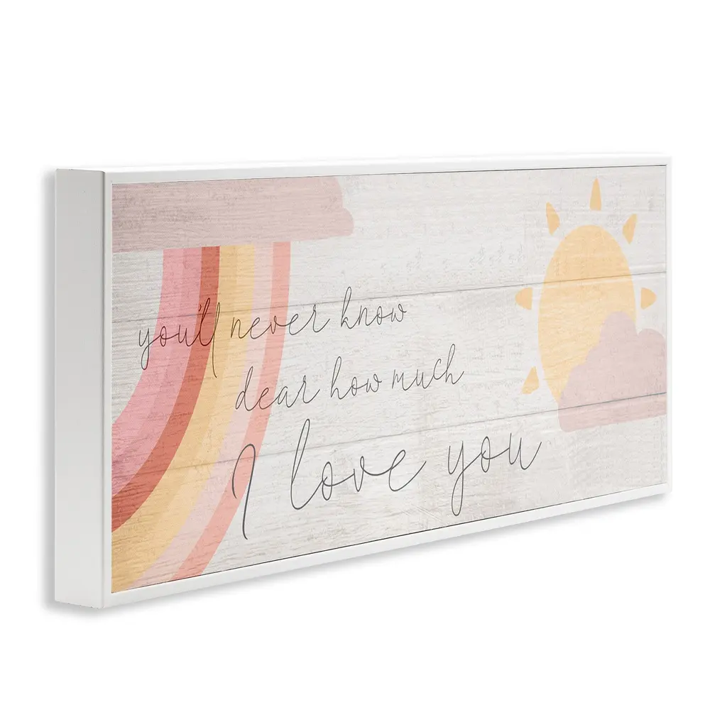 Add dimension to any room with our textured Framed Giclee Artwork. Our framed artwork is securely mounted into a 1.5-inch thick wood grain frame and ready to hang. Frames are available in three alluring styles: black, gray farmhouse and white. In addition, you should check out our oversized options if you want a statement piece. Stupell Wall Art is made in the USA.Features: Dimensions: 24 x 1.5 x 10 FramedFramed Giclee Product Sizes include 24"x10" and 30"x13". All Framed Giclee products have a 1.5" Depth.Wall Art is Ready to Hang with Hardware Free Hanging. No installation required. For Easy Set Up Lean or Layer Artwork on Shelf or Against Wall.Our giclée prints are carefully mounted on a durable MDF backing, and then perfectly finished in a 1.5 inch thick woodgrain frame. Mounted frame colors include black, gray farmhouse and white. Made In USA.Artwork Relates To: Kids, Nature, Song, Rainbow, Sun, Love, FamilyDesign by Daphne Polselli
